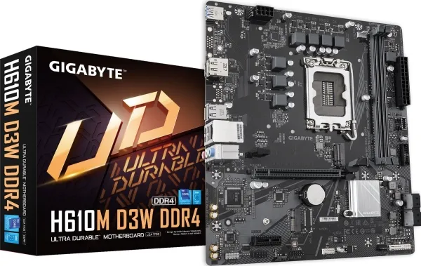 The GIGABYTE H610M D3W DDR4 motherboard is designed for users seeking a reliable and efficient platform for their computing needs. Supporting 12th, 13th, and 14th Generation Intel Core processors, this motherboard offers performance and flexibility. It features a compact micro ATX form factor that is perfect for building smaller systems while offering expansion options for upgrades.