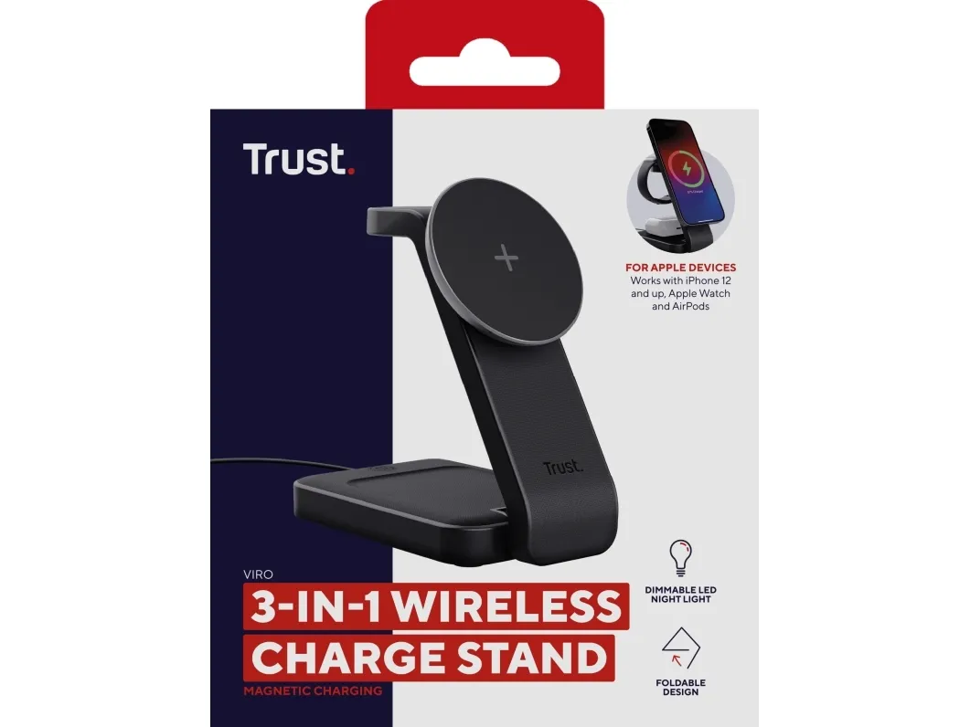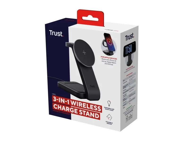 The Trust Viro wireless charging stand offers a magnetic, 3-in-1 design that enhances the charging experience for multiple devices. With USB AutoDetect charging capabilities, users can enjoy seamless charging without hassle. Equipped with a night light feature, this charging stand adds functionality in any environment, providing a gentle illumination that is perfect for nighttime use. Its foreign object detection (FOD) ensures safety by preventing disruptions caused by foreign items on the charging pad.