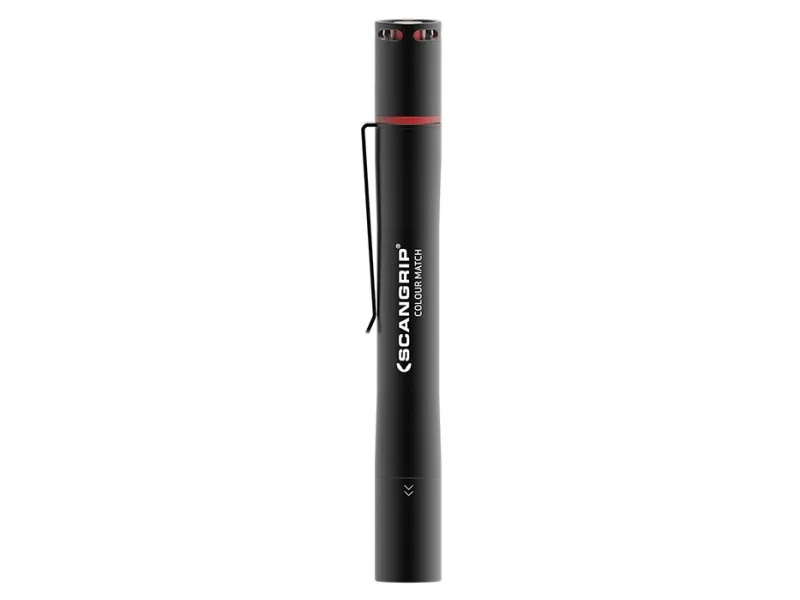 Scangrip Matchpen R penlight Matchpen R er en genopladelig pencillygte, som passer perfekt i arbejdslommen, og som med sine fremragende farvegenkendelses-egenskaber er specielt designet til detailing, inspektions- og malerarbejde. Således bevirker pencillygtens CRI+ belysning, at du vil kunne bemærke selv de mindste ridser og skrammer - og naturligvis også (små) forskelle i farverne på en given overflade. Med Matchpen R kan du vælge mellem to farvetemperaturer, hvilket udover den ekstremt høje CRI+ værdi gør lygten unik ift. at opdage forskelle i farvebelægninger samt at opdage ridser og skrammer, alt efter hvilke farver den pågældende overflade måtte have. Matchpen R tilbyder ydermere fokus-funktion, således at du kan koncentrere lyset i en 10° til 45° belysningsvinkel. Lygten er udført i holdbart aluminium og med en glaslinse, som er modstandsdygtig overfor stød. Du genoplader let Matchpen R med det medfølgende USB kabel.