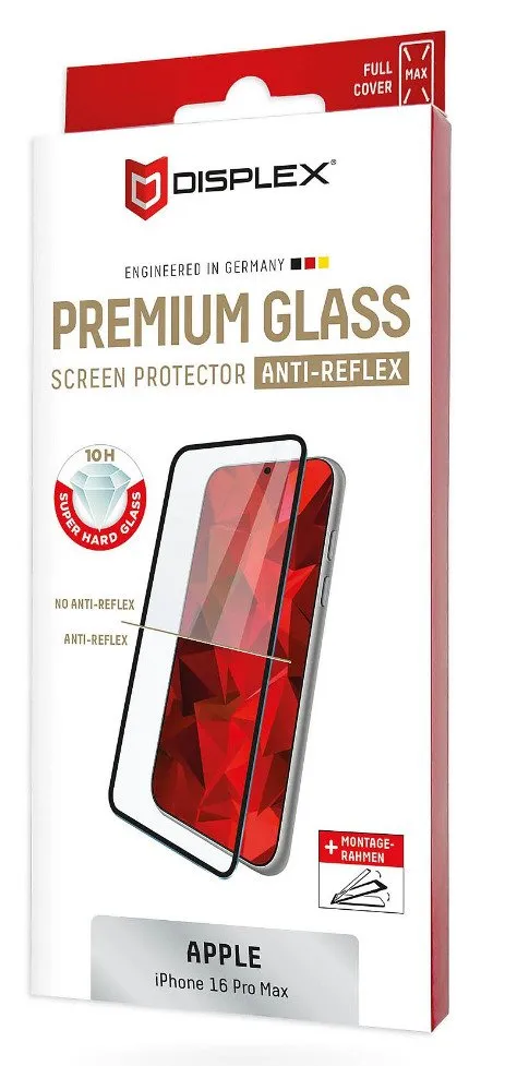 Simple & bubble-free application With the EASY-ON® Eco Mounting Frame and the accompanying video tutorials, mounting the tempered glass is incredibly quick, easy and precise. In addition the EASY-ON® Eco Mounting Frame is made of premium solid cardboard and is therefore not only sustainable, but also a 100% recyclable. The result is worth seeing: no crooked positioning of the screen protector on the display, no concealed openings for speakers or microphones and certainly no bubbles under the protective glass.Displex Premium Anti-Reflex Screen Protector (anti-reflective Full Cover, 10H) for Apple iPhone 16 Pro Max, Eco Mounting Frame, Full Cover. Brand compatibility: Apple, Compatibility: iPhone 16 Pro Max. Dry application. Protection features: Dirt resistant, Impact resistant, Scratch resistant, Shock resistant. Material: Tempered glass, Product colour: Transparent. Quantity per pack: 1 pc(s)