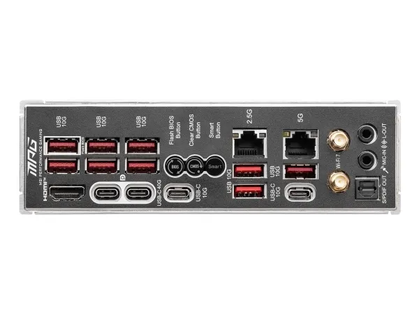 1 x HDMI 9 x USB 3.2 Gen 2 2 x USB4 2 x USB-C 3.2 Gen 2 1 x mikrofon - minijakk 1 x lydutlinje - minijakk 2 x antenne 1 x SPDIF-utgang 1 x LAN (2.5Gigabit Ethernet) 1 x LAN (5Gigabit Ethernet)