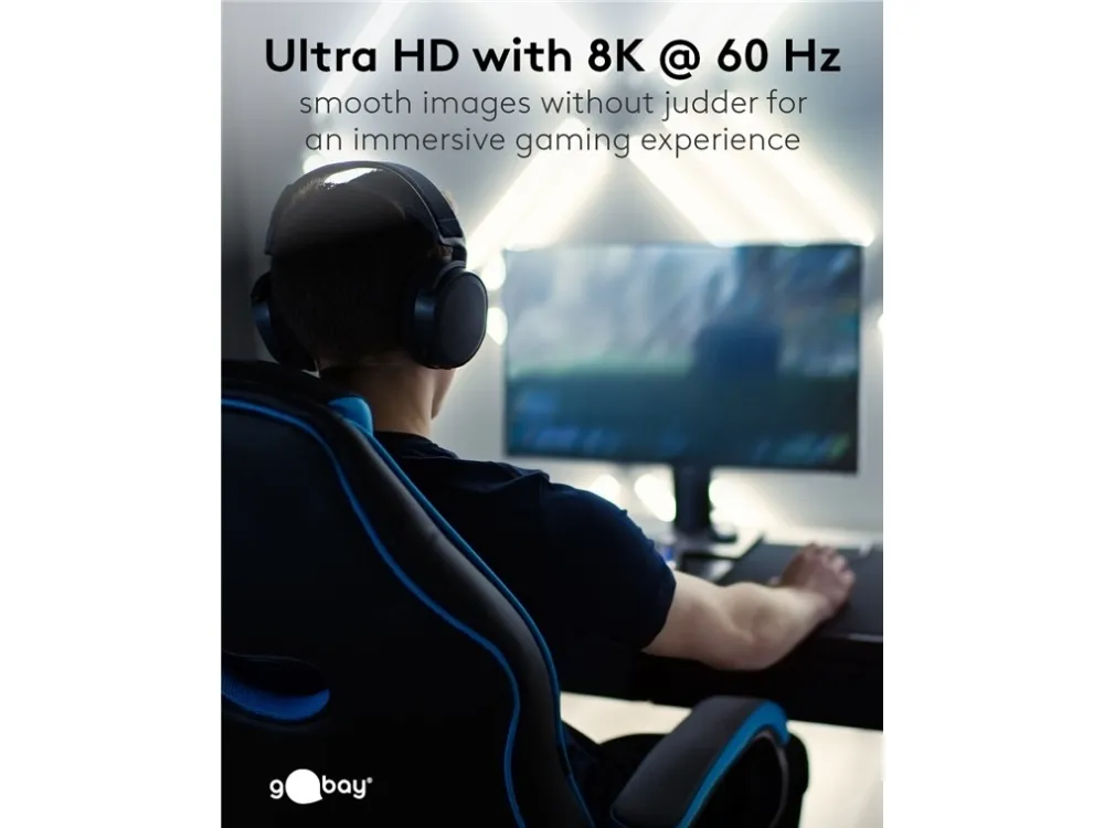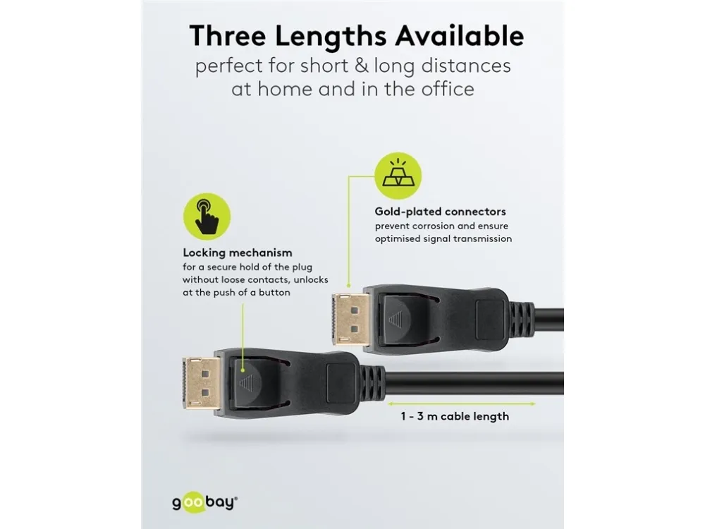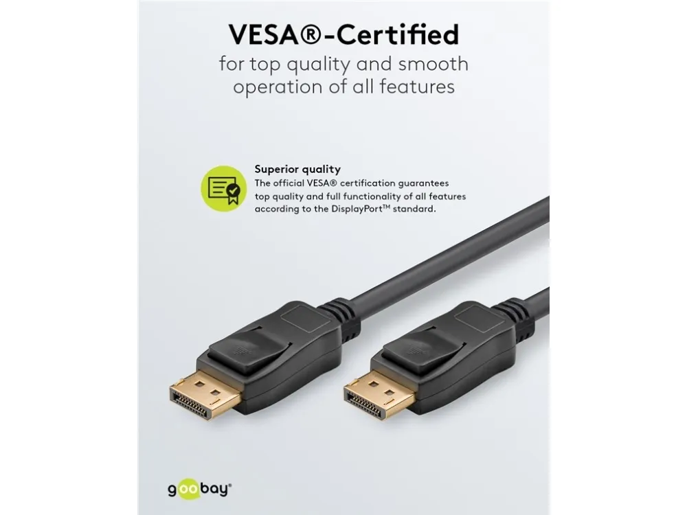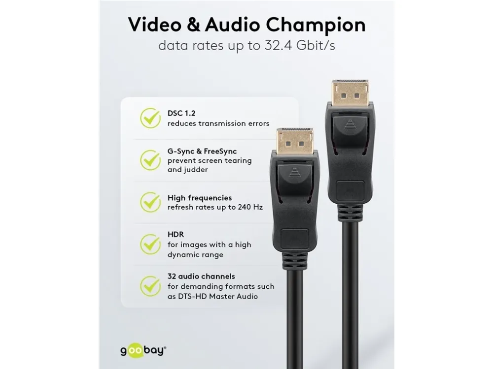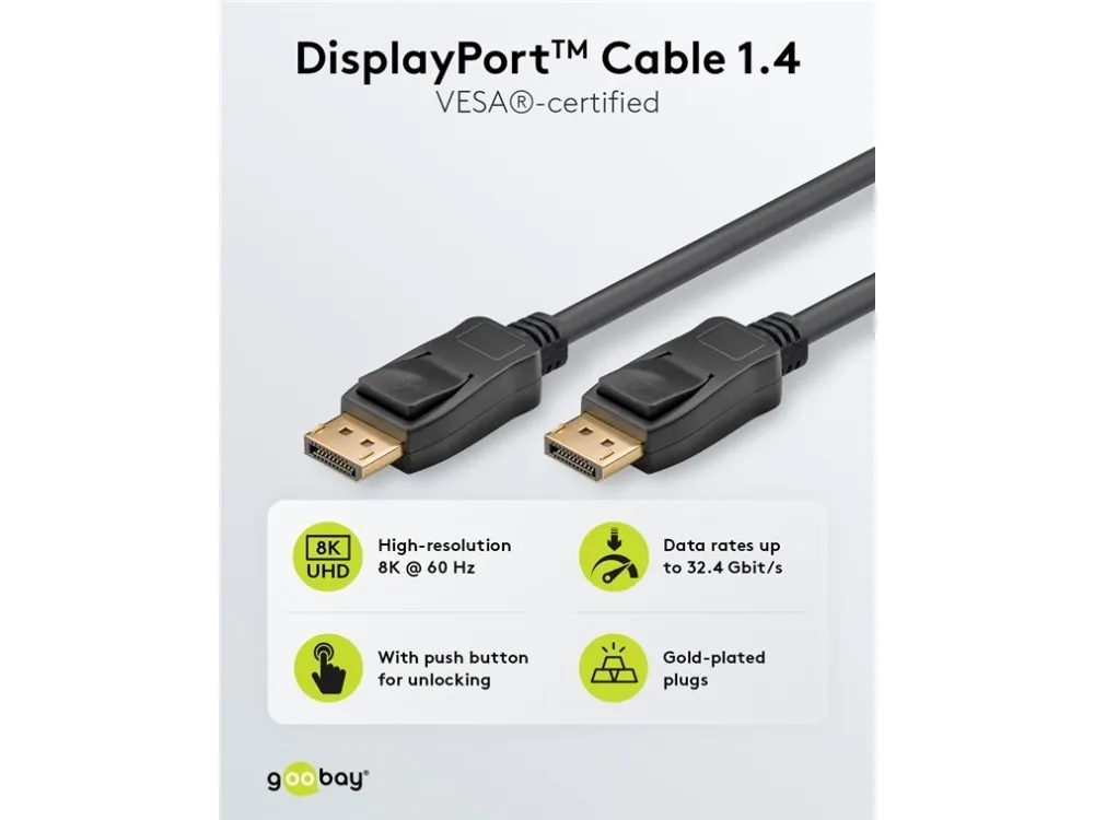8K/60Hz DSC Kabellængde Monitorkablet til signaloverførsel i høj opløsning med op til 8K @ 60 Hz eller 4K @ 240 Hz og en datahastighed på op til 32,4 Gbit/s. 8K-kabel, især til spil. Glatte billeder uden rystelser takket være høje opdateringshastigheder på op til 240 Hz (afhængigt af grafikkort og skærm) Forbedrede virtual reality-effekter, spil uden forsinkelse og high definition-streaming giver en kompromisløs underholdningsoplevelse DisplayPort™-kablet overfører videosignaler i høj opløsning og HD-lydsignaler, f.eks. fra en computer eller bærbar computer til en skærm eller en beamer. Stiklås sikrer et sikkert greb uden løse kontakter og er let at låse op via trykknappen. Kablet understøtter FreeSync og G-Sync, HDCP 2.2, Dynamic HDR samt 32 lydkanaler og mange populære lydformater, f.eks. DTS-HD Master Audio VESA-certificering