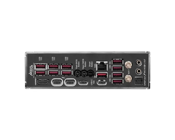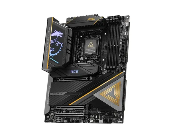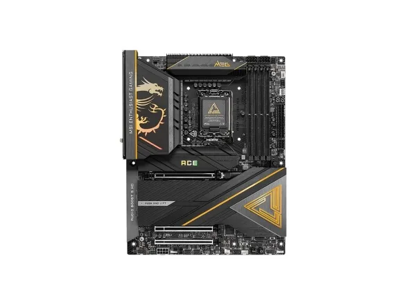 The MSI MEG Z890 ACE motherboard is crafted for performance and versatility, designed to support Intel Core Ultra processors. With four DIMM slots for DDR5 SDRAM and multiple M.2 and SATA storage options, this motherboard provides ample space for expanding memory and storage requirements. The incorporation of advanced cooling solutions, including the MSI Frozr Heatsink Design and the enlarged chipset heatsink, ensures stable operation during intense workloads while maintaining optimal temperatures. Equipped with high definition audio capabilities and a range of audio outputs, the MEG Z890 ACE delivers sound quality for an immersive experience. Connectivity options are extensive, featuring USB 3.2 Gen 2, Thunderbolt 4/USB4, and multiple Ethernet protocols including 10 Gigabit Ethernet. The MSI Mystic Light feature adds a touch of personalization, allowing for customizable RGB lighting effects that enhance the overall aesthetics of the build. Whether building a gaming rig or a high-performance workstation, the MSI MEG Z890 ACE stands out with its balance of features and performance.