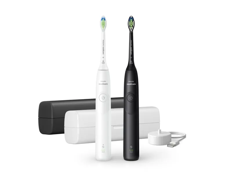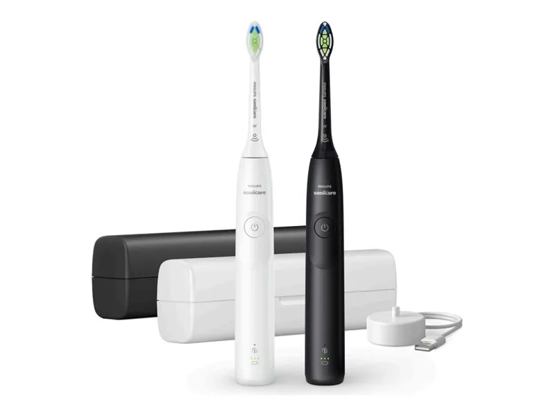 The Philips Sonicare 5300 series HX7109 electric toothbrush is designed to elevate oral care with its advanced technology. Featuring a maximum of 62,000 oscillations per minute, it ensures effective plaque removal and promotes healthier gums. The toothbrush is equipped with a Smartimer that encourages the recommended brushing time, while the pressure sensor protects gums by alerting when excessive pressure is applied. With two intensity levels, users can customize their brushing experience to suit their needs. This model is compatible with Easy click-on brush heads, enhancing convenience and ensuring optimal cleanliness with each use. Included with the toothbrush is a charging stand for easy recharging and a travel case that makes it perfect for on-the-go use. The W Optimal White brush head included in the package helps achieve a whiter smile by effectively removing surface stains. With a lithium-ion battery capable of lasting up to 21 days on a single charge, the Philips Sonicare 5300 series HX7109 provides hassle-free brushing, making it an essential tool for anyone dedicated to their oral health.