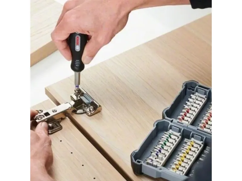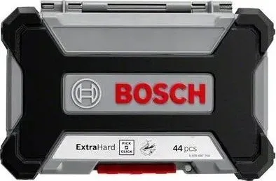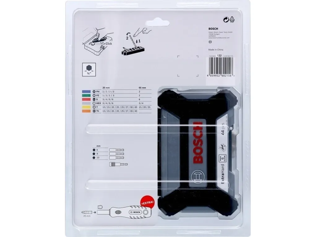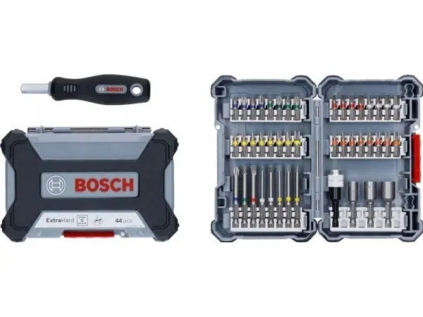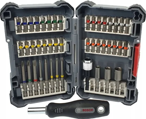 A Good Choice for Universal Use and Comes with a Modular, Easy to Transport CaseTapered torsion zone easily handles torque peaks by absorbing the force and vibrations when screw driving in all materials.Colour coding for a quick overview and easy identification of the appropriate bit type.Click-in system: The bit bundles engage securely in the click slots and you simply need to press the release tab to remove and change these.Bosch 2 607 017 692. Number of bits: 45 pc(s), Screwdrivers/bits tips included: Flat, Hex (metric), Square, Torx, Phillips screwdriver bits: PH 1, PH 2, PH 3, PH 4. Length: 65 mm, Package width: 240 mm, Package depth: 41 mm. Package type: Box