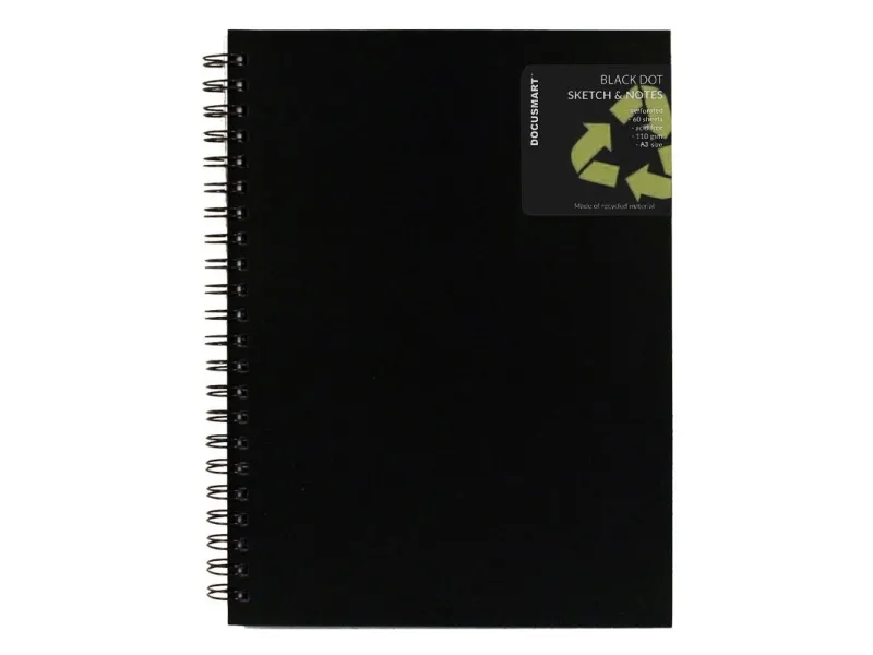 Spiralindbundet skitseblok med kraftigt 110 g papir, egnet til div. tegneteknikker og de fleste penne. A3 Ryggspiral, Svart