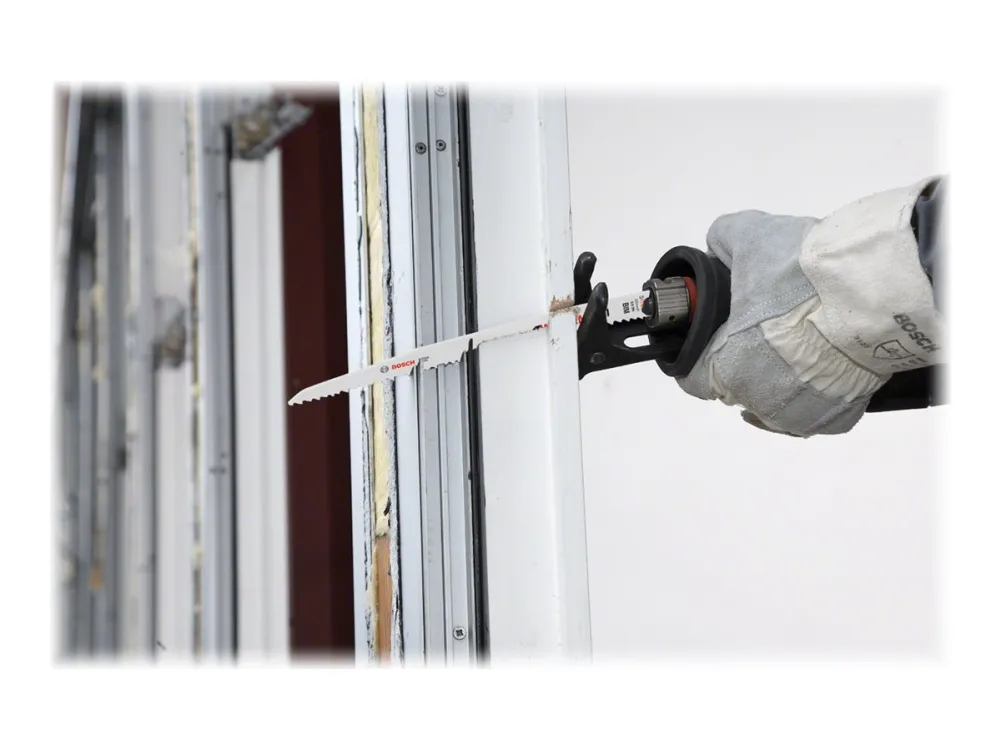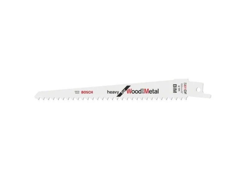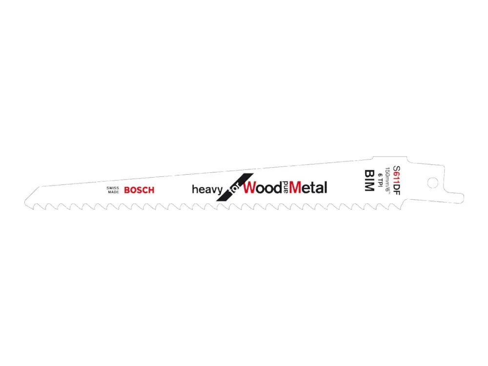 The S 611 DF Heavy for Wood and Metal Reciprocating Saw Blade delivers fast plunge cuts in wood and metal. Its large tooth pitch (4.3 mm) and side-set teeth enable quick results in all common window stock dimensions. The reciprocating saw blade's fully tapered body allows easy access to hard-to-reach areas, while its pointed tip is designed for plunge cutting. Moreover, its BIM (bi-metal) base combines an HCS (high carbon steel) blade and an HSS (high-speed steel) tooth strip, making it optimal for window demolition. It is equipped with a standard length of 150 mm, providing a cutting capacity of up to 100 mm. For use with reciprocating saws with 1/2 inch universal shank systems.