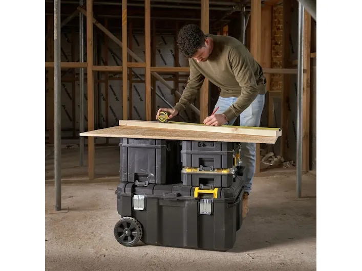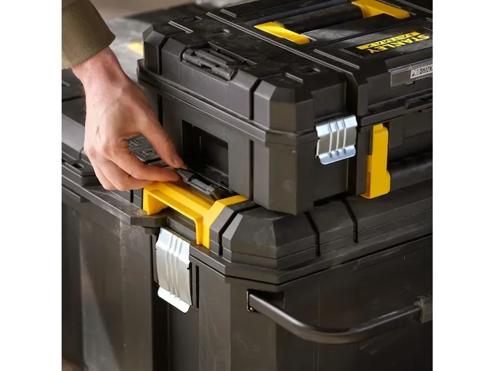 The STANLEY® FATMAX® PRO-STACK™ 113 Litre Quick Access Job Chest (66.6 x 45.8 x 34cm) is part of the STANLEY® FATMAX® PRO-STACK™ range which is a customisable, interlocking, stackable and portable storage system – offering real versatility – whatever the task. The Job Chest is designed for storing larg power tools and features a quick access lid, which enables half of the job chest to be opened to access tools, without removing other PRO-STACK™ modules. It also provides a convenient workstation by stacking multiple PRO-STACK™ modules side by side. The Job Chest is IP54 rated for resistance to dust and water spray and is complete with a telescopic pull handle for easy transportation, anti-rust metal latches for durability and a padlock eye for safety.Stanley FATMAX FMST17870-1. Product colour: Black. Width: 666 mm, Depth: 458 mm, Height: 340 mm