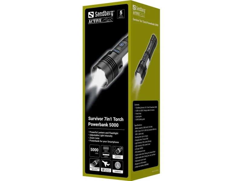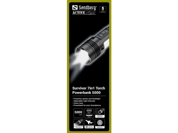The Sandberg Survivor 7-in-1 Torch Powerbank 5000 is perfect for camping or a good hike in nature. It offers a wide range of useful features in one device: powerful LED torch with multiple brightness levels and zoom lens, side lantern with multiple functions and red light option. The built-in rechargeable battery works both as a battery for the light, but can also be used as a powerbank to charge a smartphone via the built-in USB connector. Robustly built in an IPx4 certified aluminum design, so you can safely carry it with you in harsh conditions. Additionally, the torch can be used as an emergency hammer via the crown at the top.