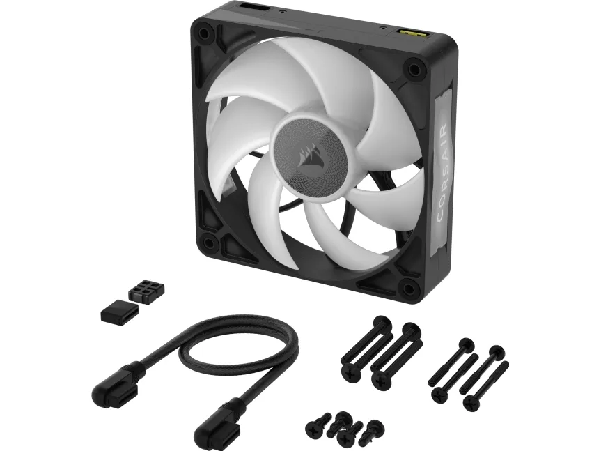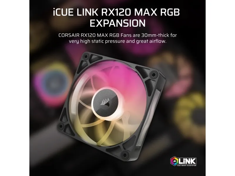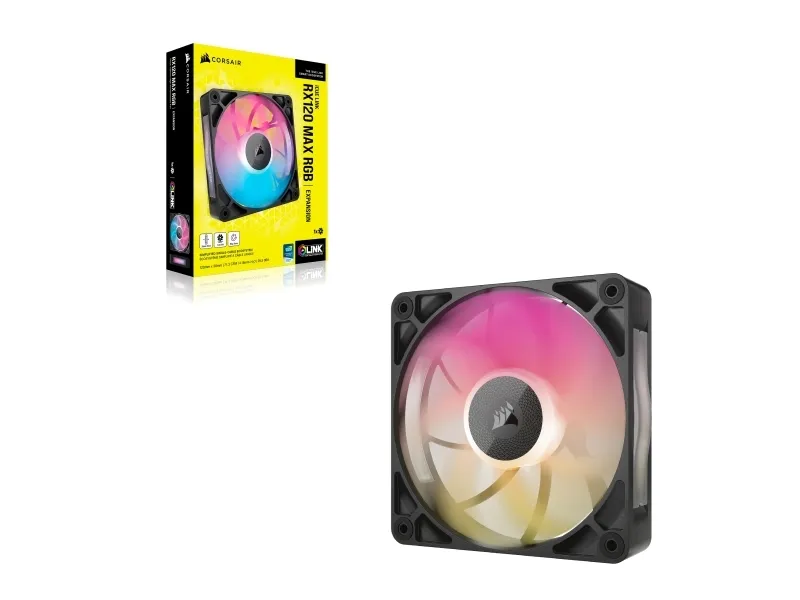 REMOVING AGE-OLD ANNOYANCES QUIKTURN SCREW REVOLUTION Take CORSAIR's QuikTurn screws for a single spin and see how convenient fan installation can be: as robust and secure as any traditional screw, and an absolute pleasure to use. Especially when you need to use 20 or more in a build.Corsair iCUE LINK RX120 MAX RGB. Type: Fan, Fan diameter: 12 cm, Rotational speed (min): 400 RPM, Rotational speed (max): 2000 RPM, Noise level (low speed): 10 dB, Noise level (high speed): 29.5 dB, Maximum airflow: 71.3 cfm, Minimum air pressure: 0.22 mmH2O, Maximum air pressure: 4.16 mmH2O. Product colour: Black