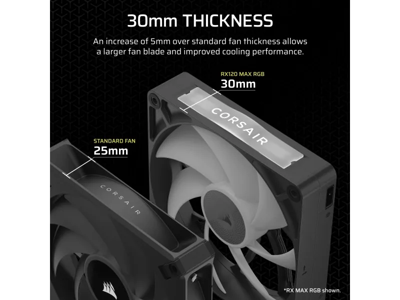 PERFORMANCE WHERE IT MATTERS THICKER FANS, MORE POWER At 30mm, RX MAX RGB fans are 20% thicker than the standard PC cooling fan. This translates directly into additional cooling power for your PC, with stronger airflow and static pressure generated by the larger fan blade.
