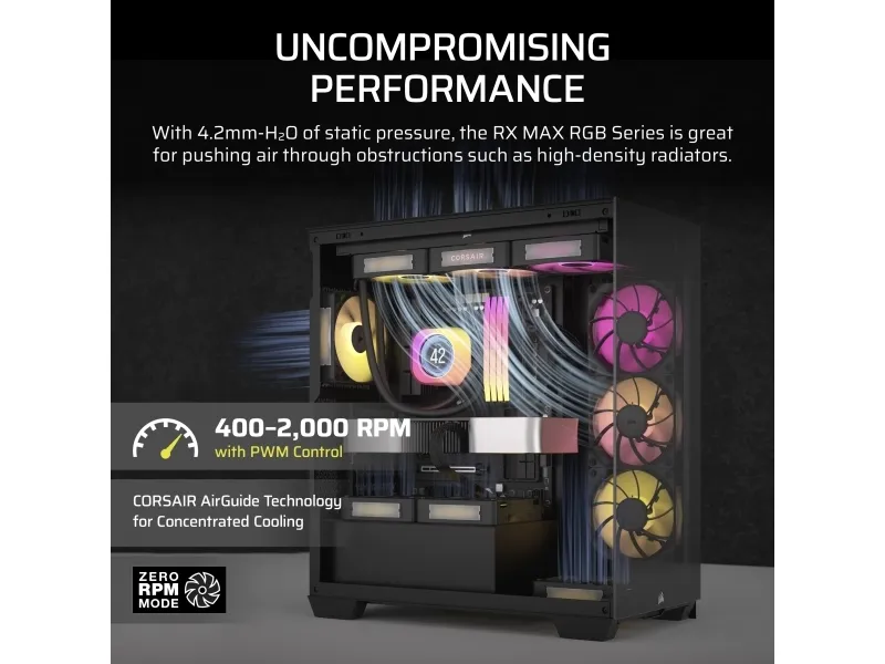 SUPERIOR AIRFLOW AND STATIC PRESSURE RX MAX RGB fans leverage CORSAIR’s expert engineering and design to maximize every benefit of its thicker housing.