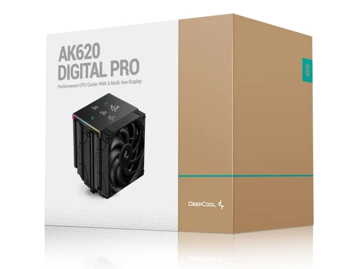The Deepcool AK620 DIGITAL PRO is a versatile processor cooler designed to maintain optimal temperatures in your system. Featuring dual 120 mm fans with a rotation speed ranging from 500 to 1750 rpm, it delivers an air flow of 60.89 cfm while operating at a noise level of just 25 dBA. The sleek heatsink, measuring 154 mm x 127 mm x 110 mm, is equipped with six 6 mm heatpipes that efficiently dissipate heat, ensuring reliable performance for demanding applications.