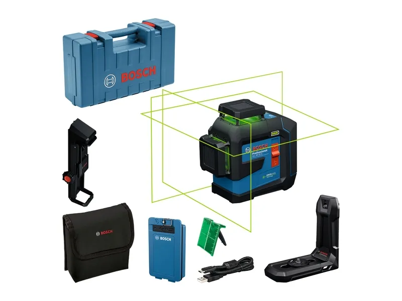 Linjelaser GLL 80-33 G, håndværkskuffert Linjelaser GLL 80-33 G, GLL 80-33 G Professional er en intuitiv linjelaser til nøjagtig justering og nivellering. Takket være IP65-beskyttelse og et langlivet, gummiforstærket hus og laservinduer er den beskyttet mod støv og vand, så du kan arbejde uden bekymringer selv på de hårdeste byggepladser. Det nye tastaturdesign giver et let valg af alle laserlinjer og giver en ekstra energisparetilstand til længere batterilevetid. Derudover giver Dual Power Dual Power-funktionen fleksibilitet til at skifte mellem 3,7V Li-ion-batteriet BA 3.0Ah XL og alkaliske AA-batterier, så du ikke skal bekymre dig om nedetid på grund af et tomt batteri. BA 3,7 V 3,0 Ah XL kan oplades under anvendelse og sørger for et problemfrit arbejdsforløb uden strømafbrydelser. GLL 80-33 G er ideal til mange forskellige anvendelser, herunder opstilling af tørvægge, justering af vinduesrammer og montering af sænkede lofter. Den store batterivisning muliggør en problemfri overvågning af butikken, mens tre 360°-laserlinjer samtidig giver mulighed for vandret og lodret nivellering - sådan sparer du tid og besvær. Linjelaser registrerer automatisk den valgfri lasermodtager LR 7 Professional. Dermed kan du straks begynde arbejdet og udvide arbejdsområdet med op til 80 meter. De lyse grønne laserlinjer giver en fire gange bedre synlighed end røde linjer for lettere nivellering - uanset hvor du befinder dig. Håndværkerkuffert. BA 3,7 V 3,0 Ah XL og USB-C™-kabel (1 600 A03 1FZ). Universalholder LB 10. RÆKKEKLEMME DK 20 (1 608 M00 C4C). Lasermåltavle. Taske