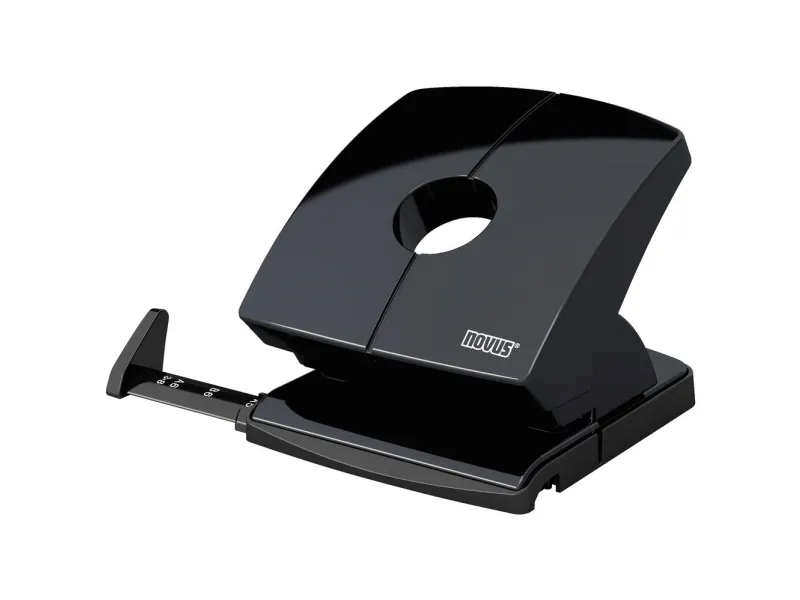 Kontorhullemaskine B 230, op til 30 ark sort, med anslagsskinne Sikker anslagsskinne med letlæselig formatvisning Folio, din A4, US, B5, din A5, B6, DIN A6, 3X8 Helmetal med plastbeklædt højglans-overdel Skridsikker bund, der kan åbnes halvt for tømning. Den stærke Kontorhullemaskine i nyt design. Med påtrykt, sikkert låsende anslagsskinne, passer til hæfteenhederne Novus B 4, B 5, B 7 og B 8. Huleffekt 30 ark.