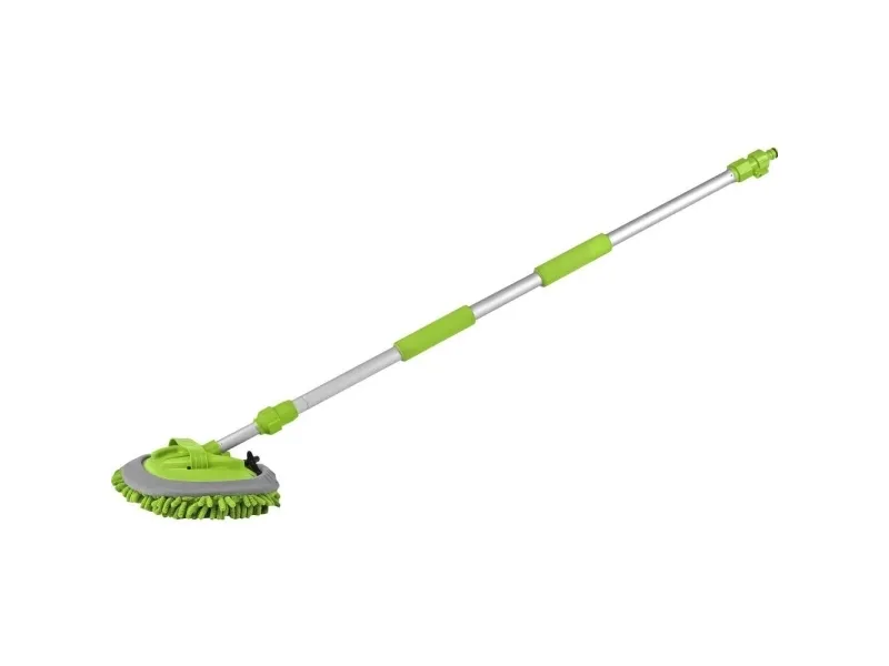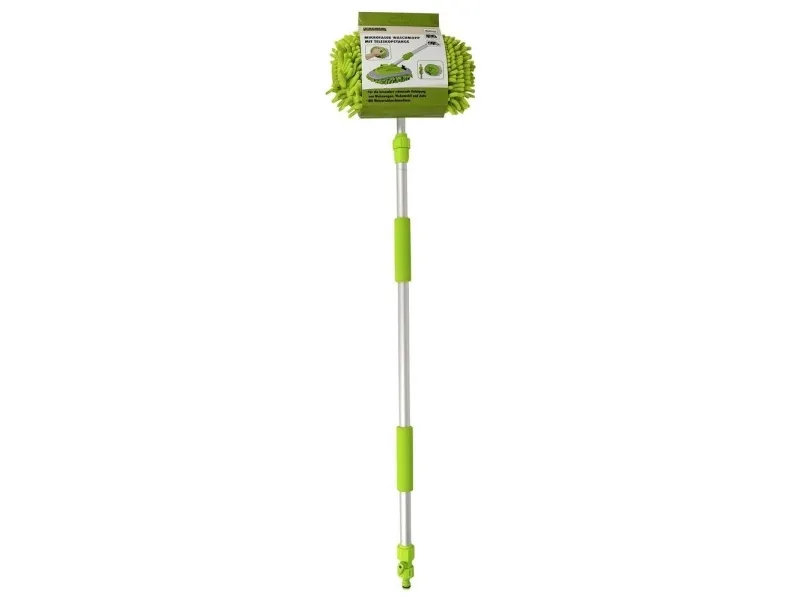Mikrofiber moppeovertræk Slangetilslutning: Stiksystem med 26,5 mm (G 3/4gevind) Længde ca. 95 - 170 cm Mikrofiber-vaskempp til særlig skånsom rengøring af autocampere, campingvogne, biler, busser, lastbiler og både. Kan anvendes vådt eller tørt. Vaskehoved kan også anvendes som børste uden teleskopstang. Teleskopstang kan forlænges fra 95 cm til maksimalt 170 cm. Med slangetilslutning