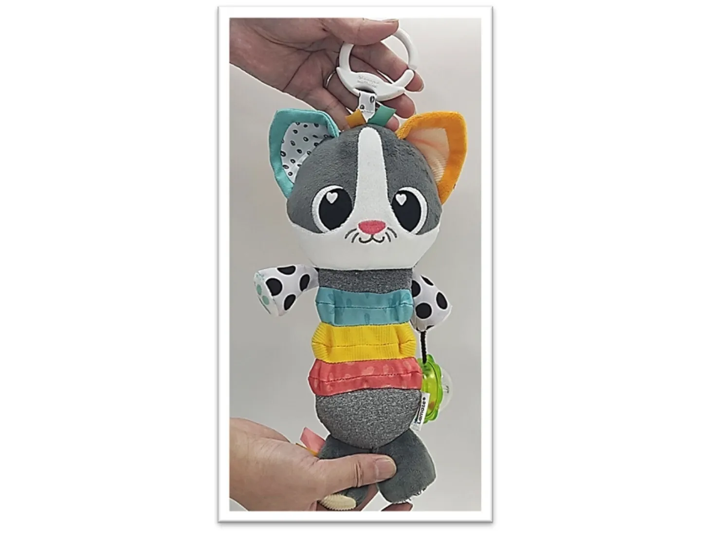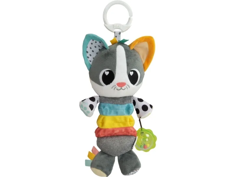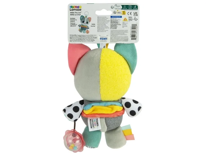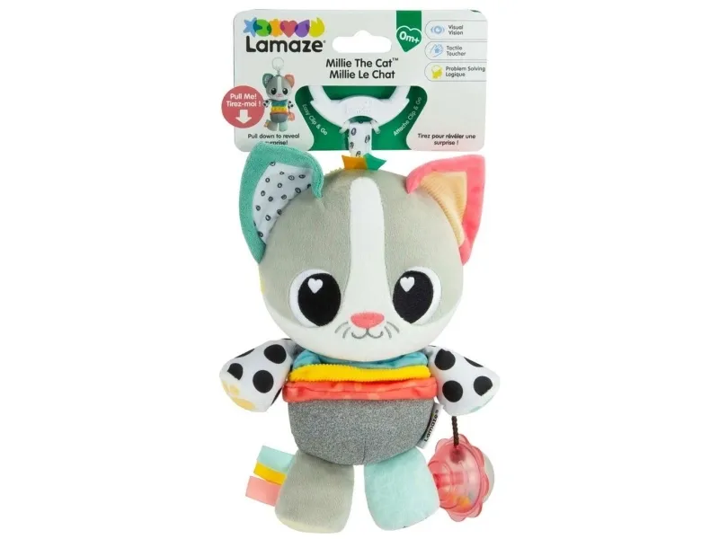 Gi babyen en purr-fect lekekamerat! Lamazes Millie the Cat utviklingsleketøy er et flott første kjæledyr for babyen. Vis babyen hvordan å trekke i føttene hjelper henne å strekke seg ut, og slipp så og lytt til den underholdende skravlingslyden hennes mens hun krymper ned til normal størrelse. Millie bærer en morsom "garn" ballrangle som også lager spennende lyder og er en annen fin måte å introdusere babyen for konseptet årsak og virkning. Denne myke og kosete kattungen har lyse farger og kontrasterende mønstre som bidrar til å stimulere babyens visuelle oppfatning. Babyen din vil også elske å oppdage de knitrende ørene og satengbåndene. Millie inkluderer en multifunksjonsklips, designet for å enkelt festes til barnevogner eller bleievesker, slik at hun kan reise med babyen uansett hvor dagen tar deg.
