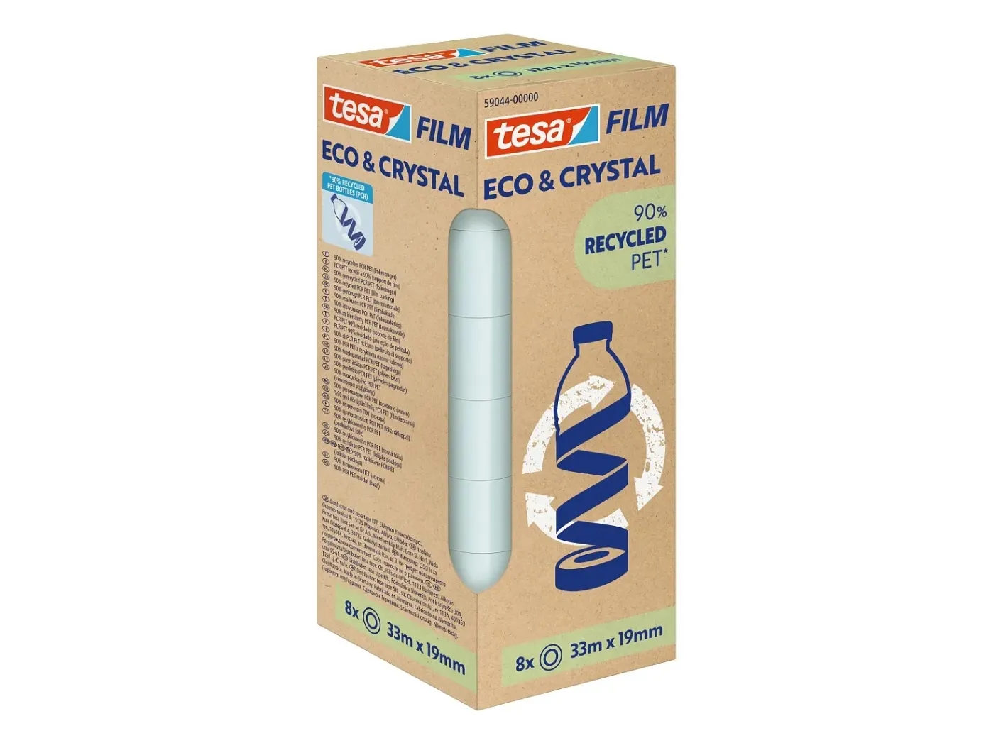 tesafilm® eco & crystal-tape - transparent klæbefilm af genbrugt PET-materiale - rivefast, med stærk klæbeevne Bidrag til bæredygtighed: 90 % af materialet består af genanvendte PET-flasker Klar kvalitet: Fuld transparent med stærk klæbekraft - næsten usynligt på mange underlag Ydelsesstærk: Klæbefilmen er modstandsdygtig og bevarer klæbeevnen over en lang periode Ruller stille af: Tapen løsner sig stille fra rullen - til lydsvag anvendelse Nem at bruge: Kompatibel med alle tesafilm®-afrulningsere 90 % genanvendt del: Certificeret i henhold til UL 2809 (ECVP Environmental Claim Validation Procedure) Regeringscyklusprøvning efter INGEDE-metode 12: Påvirker ikke behandlingen af kartonage