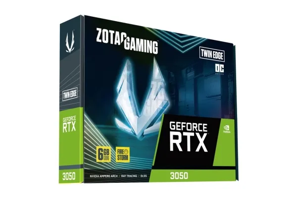 Experience performance with the ZOTAC GAMING GeForce RTX 3050 6GB Twin Edge graphics card. This OC Edition card harnesses the power of NVIDIA's Ampere GPU technology, designed to elevate your gaming visuals and speed. With 6 GB of GDDR6 video memory and a 96-bit bus width, the RTX 3050 delivers frame rates and enhanced graphics in your favorite games, supporting resolutions up to 7680 x 4320 for clarity.