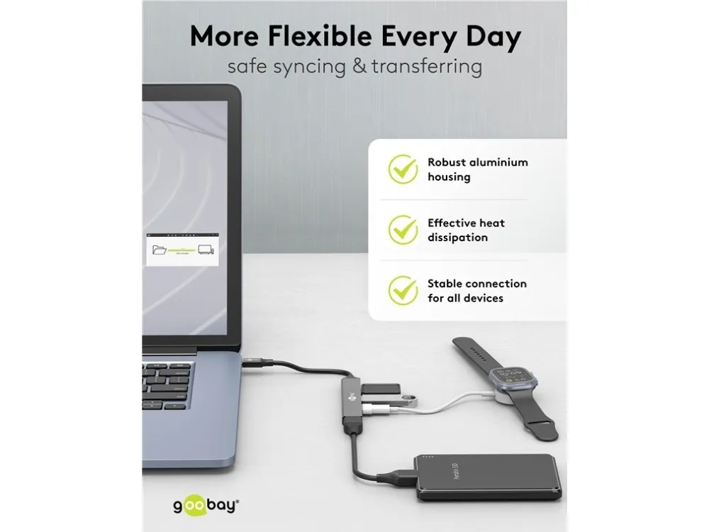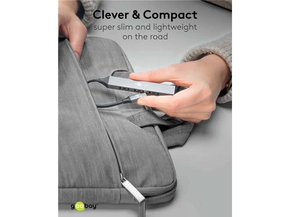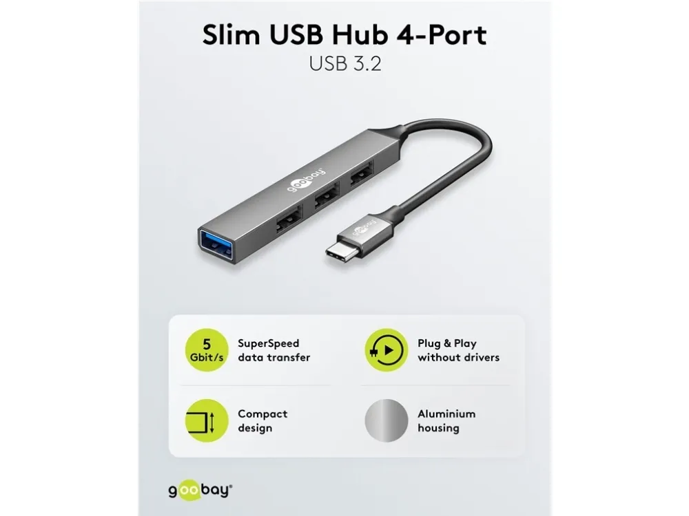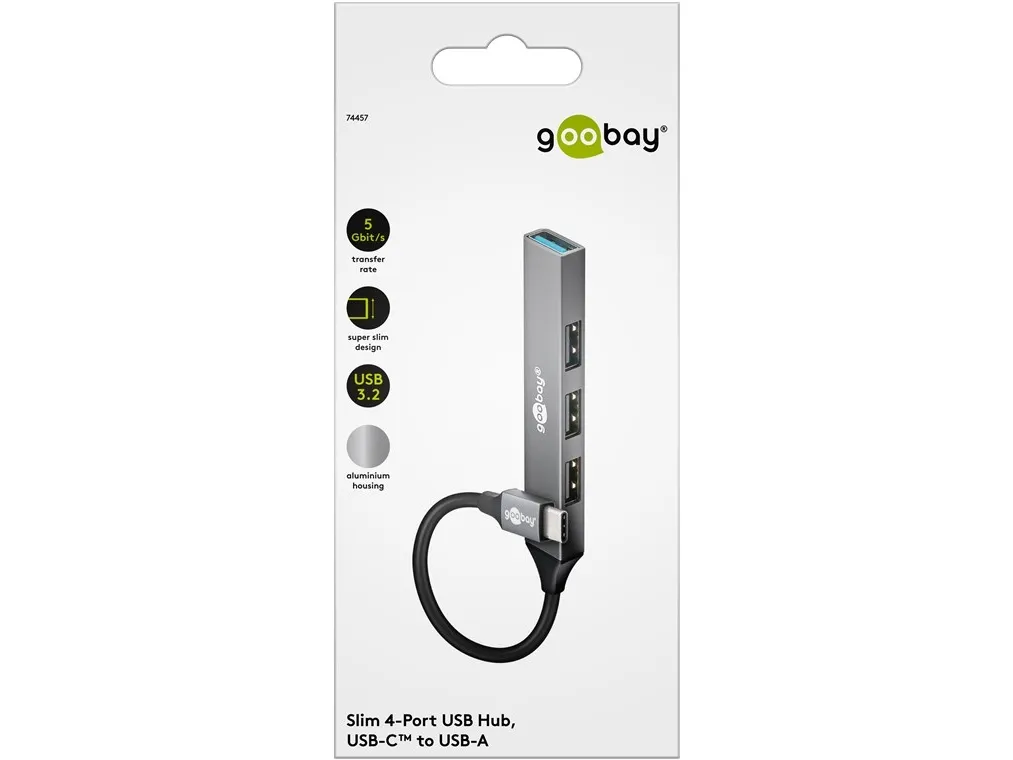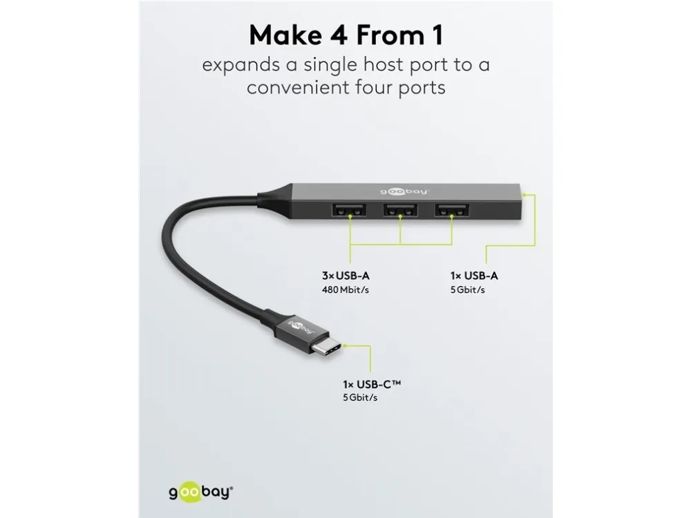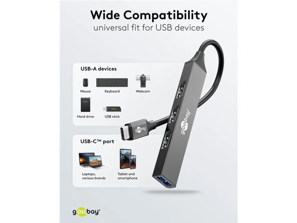 USB-C™-stik (USB 3.2) > 1x USB-A-hunstik (USB 3.2), 3x USB-A-hunstik (USB 2.0) Den praktiske USB dock udvider en USB-C™-enhedsport til fire USB-A-porte: En enkelt tablet- eller laptop-port kan dermed betjene op til fire perifere enheder Kompatibel med alle standard USB-enheder, f.eks. smartphones, Apple MacBook, tastaturer, mus, webkameraer, harddiske (SSD, HDD) eller headsets – uden behov for at installere separate drivere USB-C™-adapteren understøtter SuperSpeed-datahastigheder på op til 5 Gbit/s via USB 3.2-porten og op til 480 Mbit/s via hver af de tre andre USB 2.0-indgange I sit ekstra kompakte, slanke format passer denne USB-C™ hub i enhver taske og er en praktisk følgesvend på rejser og på farten Med et robust aluminiumshus af høj kvalitet, der giver en behagelig fornemmelse og fremragende holdbarhed USB-adapteren er kompatibel med SSD via NVMe, operativsystemer som Windows, macOS, Linux eller Android og bagudkompatibel med USB 3.0 og USB 2.0