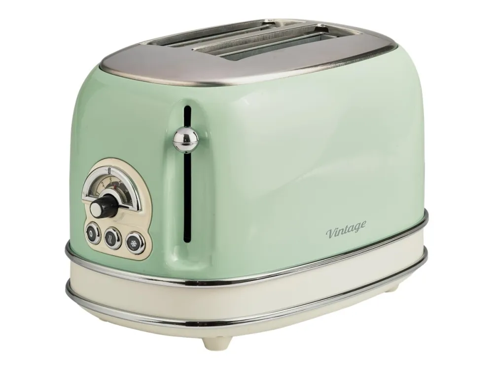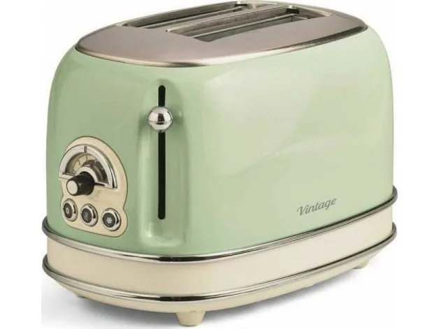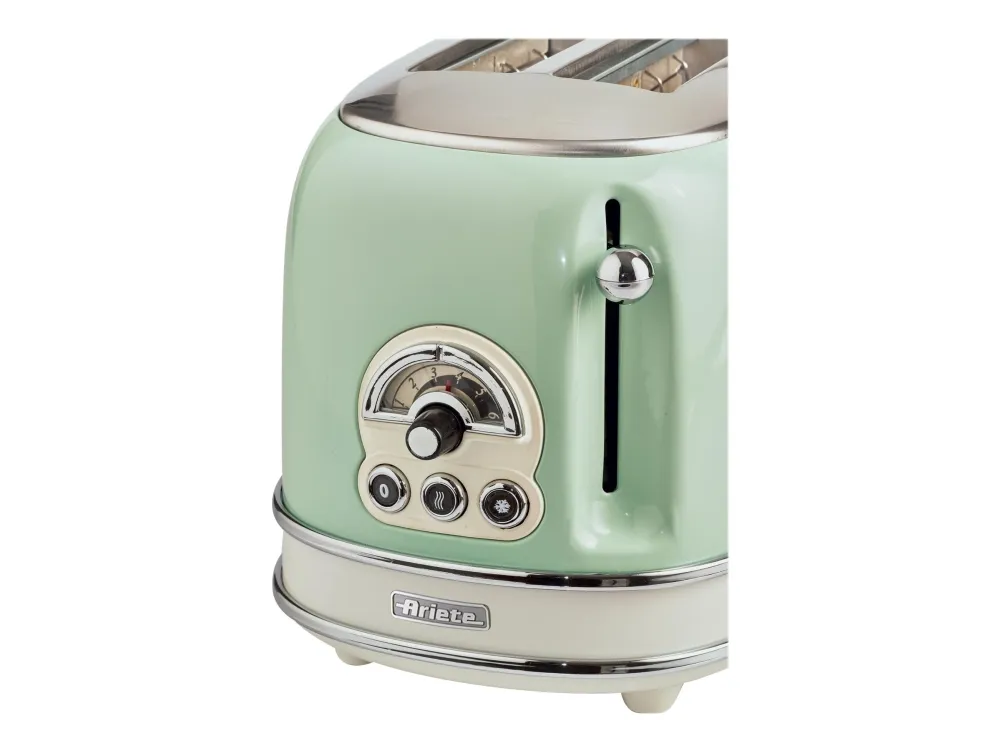 The Ariete 155 Vintage Electric Toaster is the design toaster which, with its unique shapes and pastel colors, decorates your kitchen. The compact size of this toaster makes it a perfect decor element for the kitchen. The Vintage electric toaster features 2 slots for browning the slices of bread at 6 different toasting levels. When the toast is ready, the automatic eject function allows you to take the slice of bread safely. The removable crumb tray ensures easy cleaning and the lower cord compartment allows you to save space. The Vintage Toaster features a sturdy design: the stainless steel outer walls in pastel colors make it a unique and unmistakable object in the panorama of small kitchen appliances.