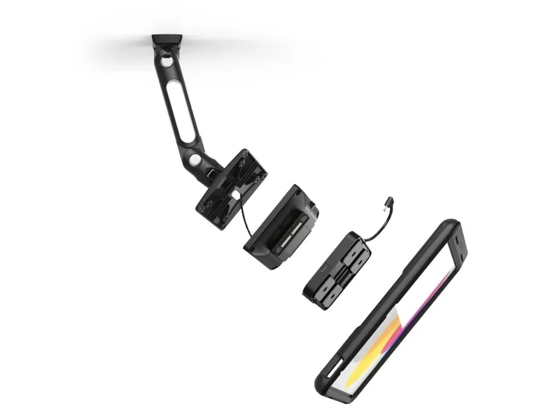 Allows data and power transfer through USB-C interface, locking mechanism for tablet security, "lift to release" mechanism, integrated kickstand on tablet side, tilt, pan, and swing for multiple display angles and cable-free charging.
