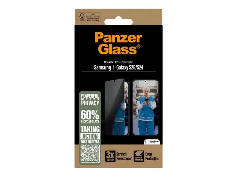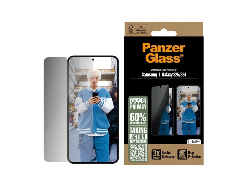 Check out our PanzerGlass privacy screen protector! Made with 60% recycled glass, it keeps your personal stuff hidden from nosy neighbors on the train, at the coffee shop, or in the office. The privacy filter makes your screen's content invisible to anyone but you. It even has a smudge-free coating that reduces traces of fingerprints and grease and ensures 100% compatibility with your screen's ultrasonic fingerprint reader, so you can be sure that your phone unlocks smoothly every time.This screen protector keeps your phone screen safe from accidental bumps, crushing falls and other hazards of everyday life. Or to put it in more sustainable terms: It prolongs the lifetime of your phone, thereby postponing the need to produce new phones. This is one way of working toward a more sustainable future. Another is to use less packaging: For this screen protector, we have managed to reduce the paper packaging by 33%* compared to previous models. This product comes in a recyclable FSC-certified box.The screen protector comes with an EasyAligner that makes installation a piece of cake (seriously!), and to make it even easier, we've included step-by-step instructions as well as a QR code for quick access to our online how-to video. And remember: Once the screen protection is applied, you'll never again fear the sight of your phone tumbling to the ground screen first. This may not happen, but if it does, you'll regret not having clicked "add to cart".The screen protector is Ultra-Wide Fit, meaning it covers the front surface of your phone to provide superb screen protection and a complete screen view, while still leaving a little room around the edges for a PanzerGlass case. If you want extra phone protection, combine the screen protector and case with a PanzerGlass PicturePerfect or Hoops camera lens protector.*Measured by third-party lab by comparing the mass of the new paper packaging introduced in 2023 with the mass of the previous paper packaging introduced in 2022 (CPRTC, report No. ZSA20231301-0016).