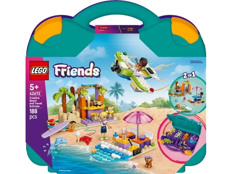 Dette 2-i-1-byggelegesettet tar barn med på en kreativ reise mens de bygger og bygger om forskjellige strandscener. Lekesettet LEGO® Friends Kreativ reise- og strandkoffert (42672) for barn er en fantastisk gave til jenter og gutter fra fem år. Barn kan bygge tre modeller med settet og deretter bygge dem om til alternative scener, eller de kan bruke kreativiteten sin til å bygge fantasifulle modeller av delene. Dette late som-settet har alt barn trenger for å bygge et sjøfly med roterende propell, et avslapningsområde med surfebrett og en strandkafé med sandslott, sitteplasser og iskremtilbehør. Modellene kan bygges om til en speedbåtleke, et utendørs sitteområde og en pizzeria med pizzaovn. Byggeleken inneholder to minidukker og figurer av en hund og en delfin, som kan brukes i rollelek. Når barn har bygd og bygd om alle modellene, kan alle delene pakkes ned i kofferten, klar for nye eventyr. Byggesettet inkluderer et klistremerkeark som barn kan bruke til gøyal tilpasning av kofferten.