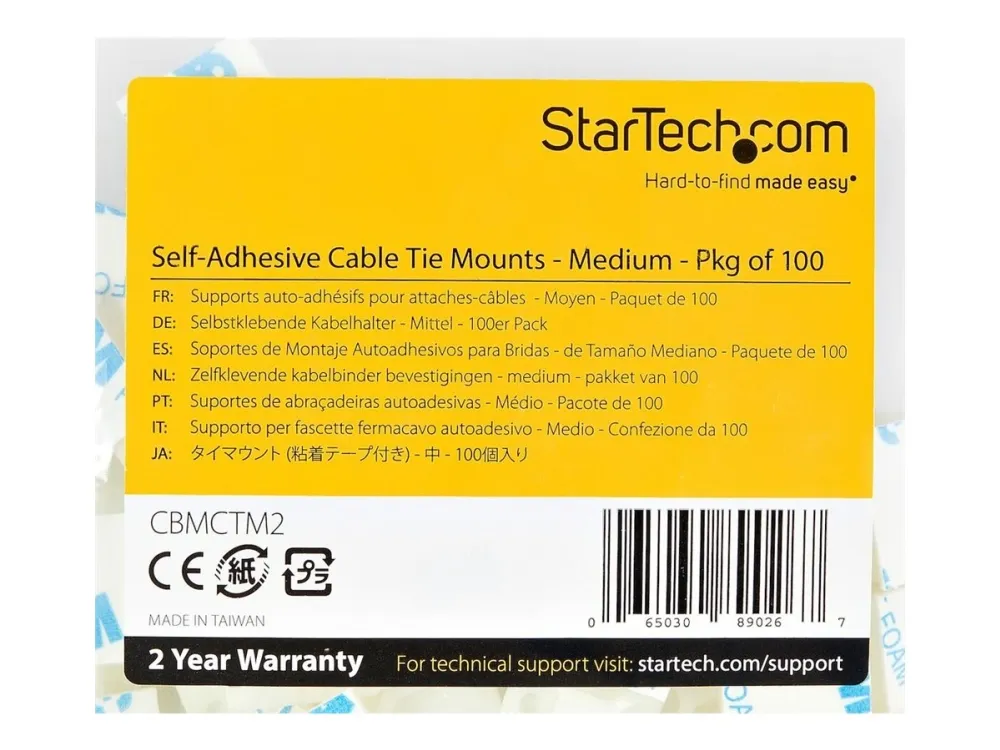 StarTech.com 100 Pack Cable Tie Mounts with Adhesive Tape for 0.18 in. (4.6 mm) Wide Ties, Nylon/Plastic Zip Tie Mounts, Electrical/Network Cable Wrap Mounts / 94V-2 Fire & UL Rated TAA - Nylon 66 Zip Tie Mount (CBMCTM2) - kabelviklermontering - TAA-samsvar