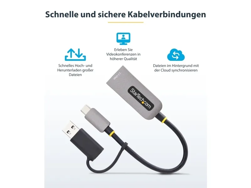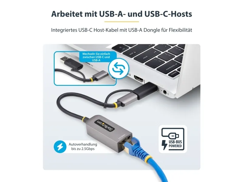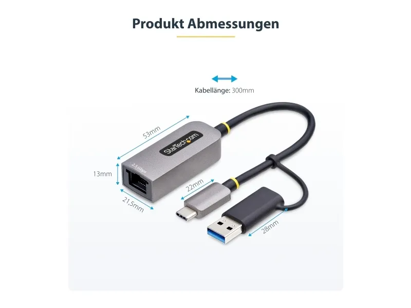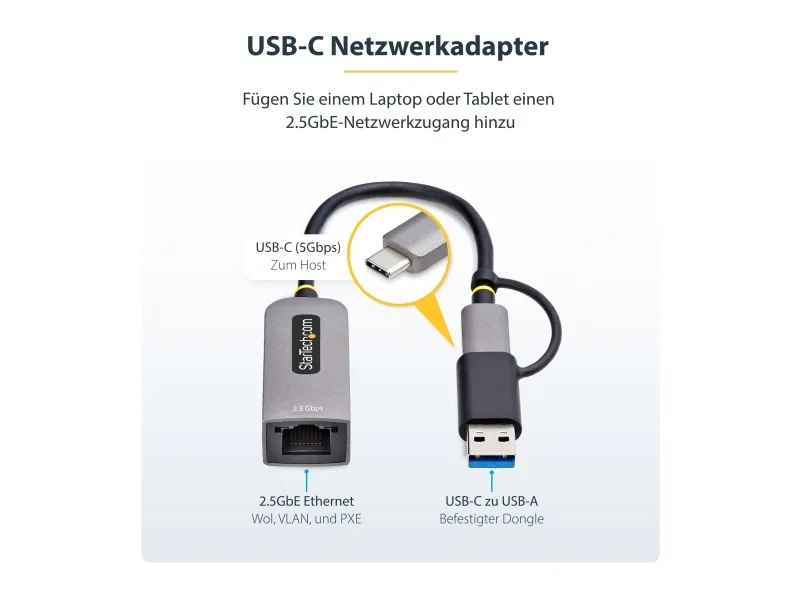 The StarTech.com Advantage StarTech.com 2.5GbE USB-C to Ethernet Adapter with USB-A Converter, NBASE-T NIC, USB 3.0 Type-C 2.5/1G Multi Speed Network, Thunderbolt Compatible, Windows & Mac. Connectivity technology: Wired, Host interface: USB Type-C, Interface: Ethernet. Maximum data transfer rate: 5000 Mbit/s. USB powered. Product colour: Grey
