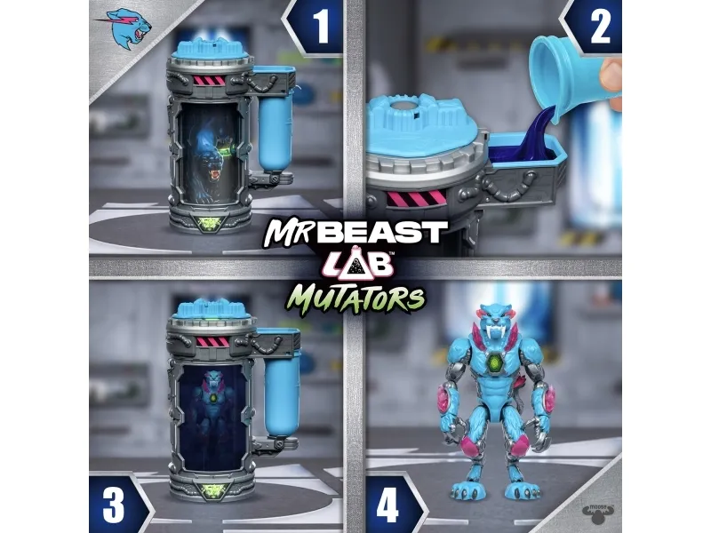 MrBeast Lab Mutator Iconic Panther! Udfør eksperimentet og skab en sej MrBeast-inspireret actionfigur! Den ikoniske Panter Mutant er 13 cm høj og har over 20 bevægelsespunkter! 5+ år!