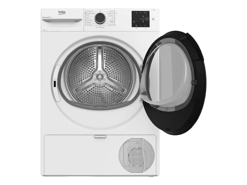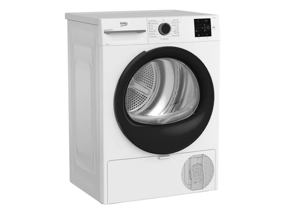 Beko BM3T38230W. Appliance placement: Freestanding, Loading type: Front-load, Drying system: Heat pump. Rated capacity: 8 kg, Condensation efficiency class (old): B, Condensation efficiency class: C. Energy efficiency class: E, Annual energy consumption: 1.44 kWh, Heat source: Electric. Beko technologies (clothes care): Aquawave. Depth: 545 mm, Width: 598 mm, Height: 846 mm