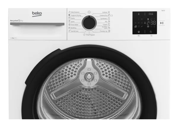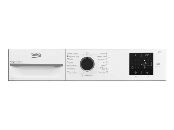Beko BM3T38230W, Frittstående, Frontmatet, Varme pumpe, Hvit, Rotasjon, Berøringskontroll, Riktig/Høyre
