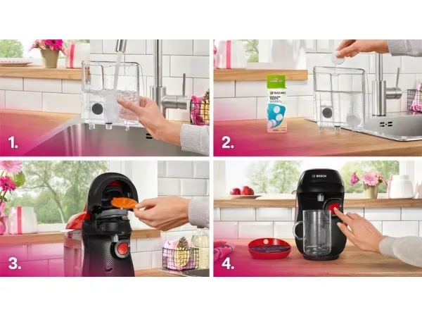 The Bosch TASSIMO HAPPY coffee machine is designed to enhance your coffee experience with its versatile brewing options. With the ability to prepare a variety of beverages including espresso, cappuccino, latte macchiato, and hot chocolate, this machine ensures each drink is crafted to perfection. The INTELLIBREW system automatically adjusts the brewing parameters for each type of beverage, delivering consistent results every time. The adjustable cup support accommodates various cup sizes, making it convenient for every user. The removable water tank has a capacity of 0.7 liters, ensuring easy filling and cleaning for daily use.
