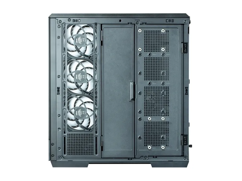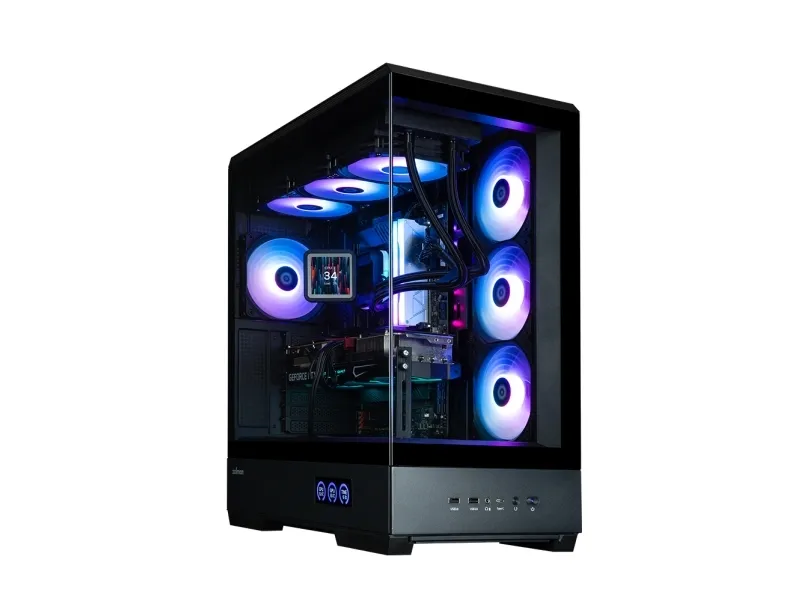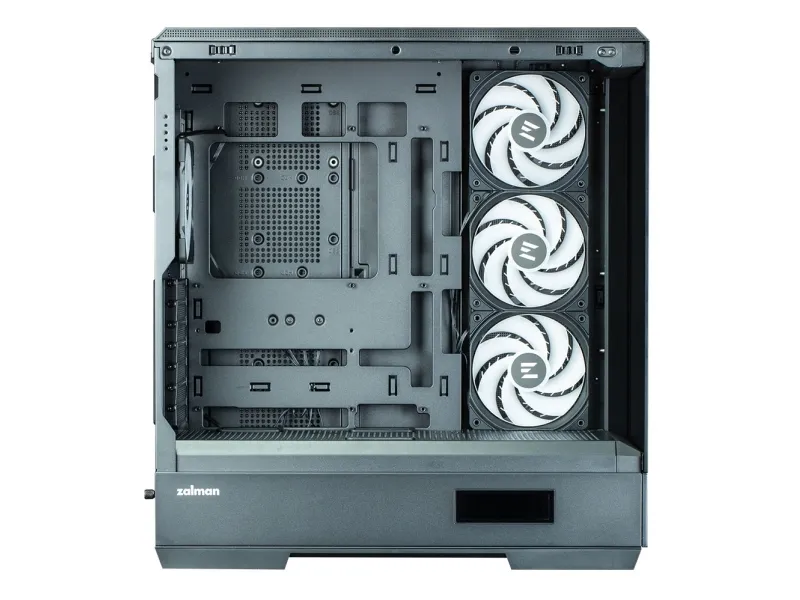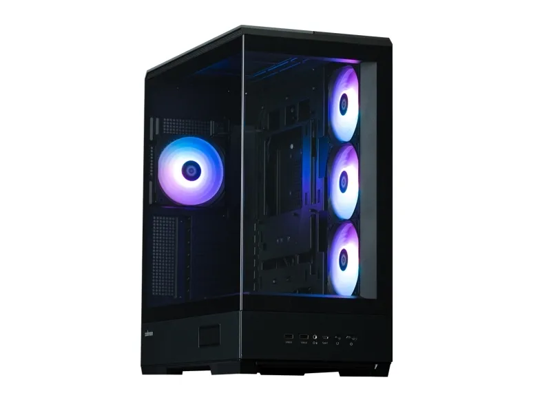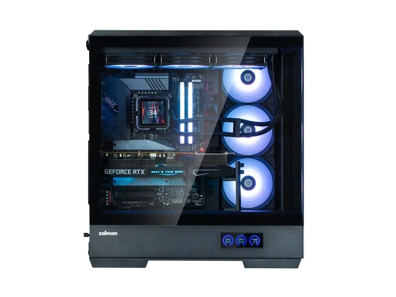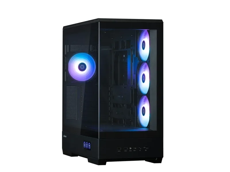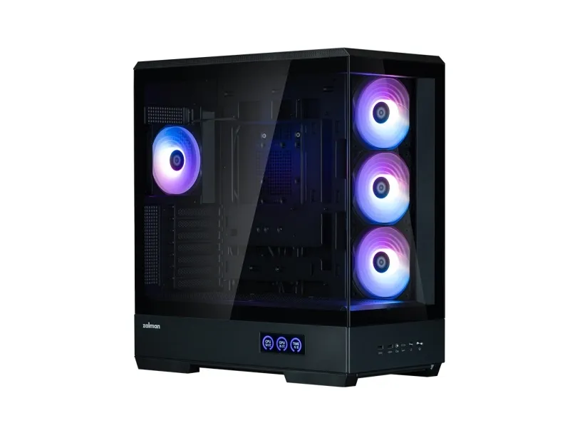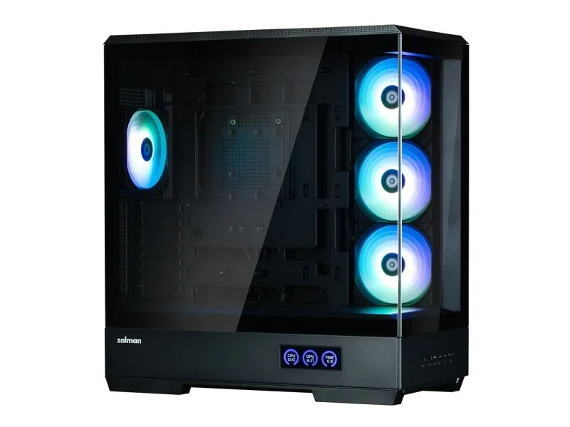 The ZALMAN P50 DS tower chassis features a mid-tower form factor that balances aesthetics and functionality. Equipped with a top panel dust filter and a bottom dust filter, this chassis prevents dust accumulation inside, maintaining airflow and performance. The built-in display provides essential information at a glance, while the toolless side panel allows for easy access, making system assembly and upgrades hassle-free. With the capacity to support up to five internal bays, and a design accommodating video cards up to 435 mm in length and CPU coolers up to 178 mm in height, the P50 DS is versatile for various builds. The 2-piece panoramic glass offers a view of the internal components, complemented by ARGB fans that add flair to any setup. Cable management features streamline organization, ensuring a clean appearance inside and out.