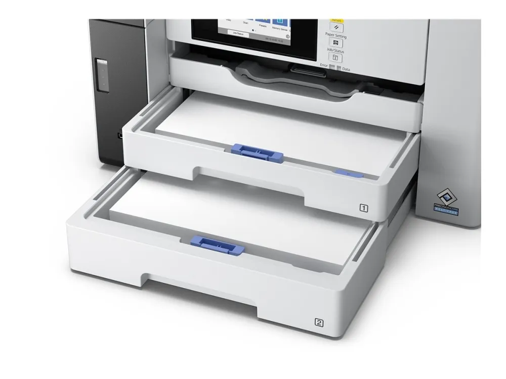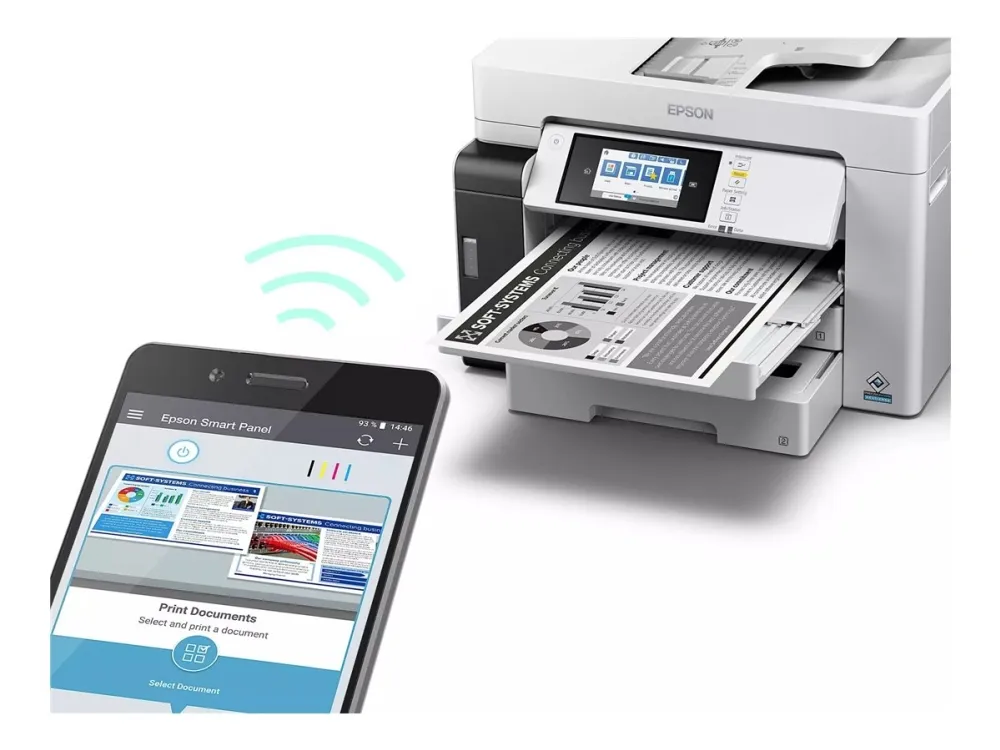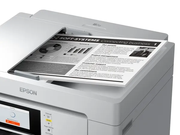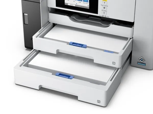 Epson EcoTank Pro ET-M16685 er en allsidig skriver, kopimaskin og skanner designet for store utskriftsbehov. Den har omfattende tilkoblingsmuligheter, inkludert USB, LAN og Wi-Fi, som gir mulighet for mobil utskrift via plattformer som Apple AirPrint og Epsons serie med mobilapper. Med en robust dokumentmaterkapasitet og høy standard mediekapasitet sikrer denne skriveren effektivitet og pålitelighet både hjemme og på kontoret.