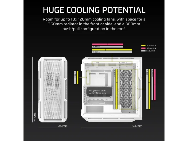 Foran: 120 mm viftemontering x 3 / 2 x 140 mm vifte eller 120/140/240/280/360 mm radiator støttet Topp: 120 mm viftemontering x 3 / 2 x 140 mm vifte eller 120/140/240/280/360 mm radiator støttet Side: 120 mm viftemontering x 3 / støtter radiatorer på 120/240/360 mm Bak: 120 mm viftemontering x 1 / støtte for 120 mm-radiator