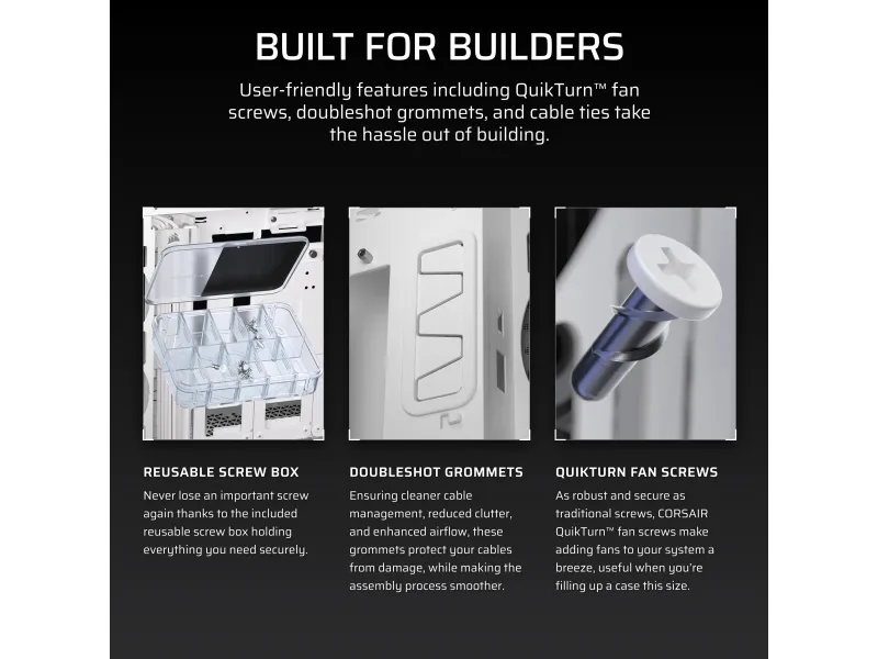 Front I/O-adapter, kabellisser, skruer, 28 x QuikTurn vifte skruer, skruesortimentsboks