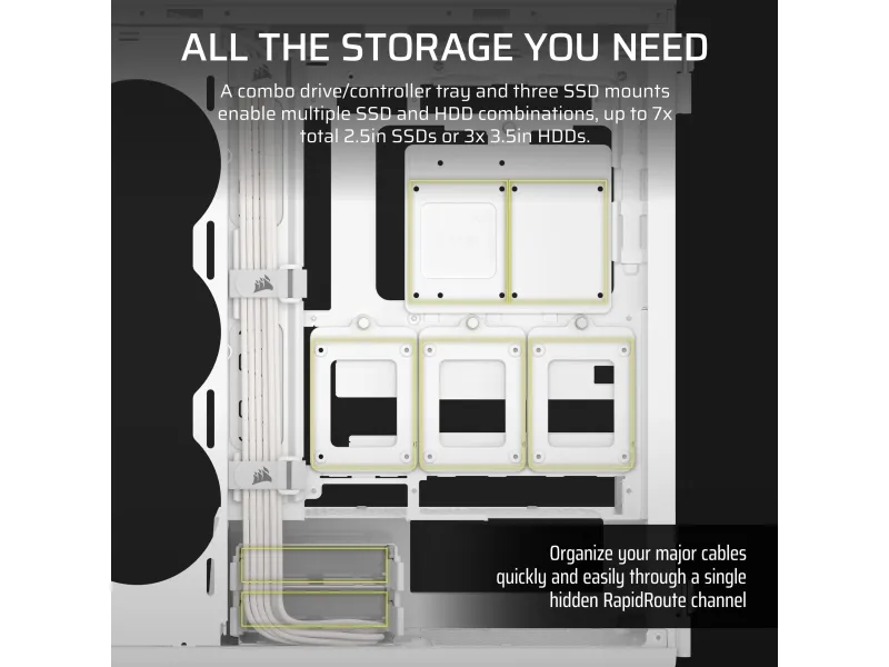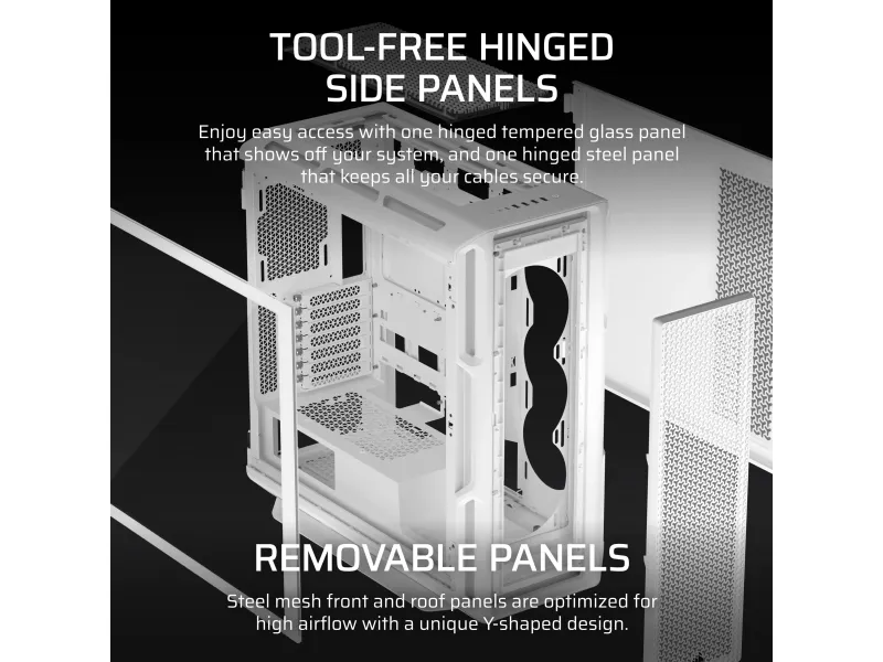 Støttehovedkort for baktilkobling, verktøyløse sidepaneler, PSU-skjermutskjæring, integrert kabelhåndtering, RapidRoute kabelhåndteringssystem (46 mm klaring), maskefrontpanel, nettet toppanel, vertikal/horisontal grafikkortorientering, 3D Y-mønster luftstrøm frontpanel, bunnstøvfilter, magnetisk støvfilter på siden, toppmagnetstøvfilter, toppanelsstøvfilter, gummikabelhullmaljer