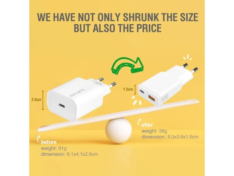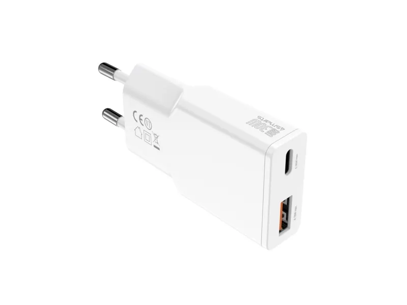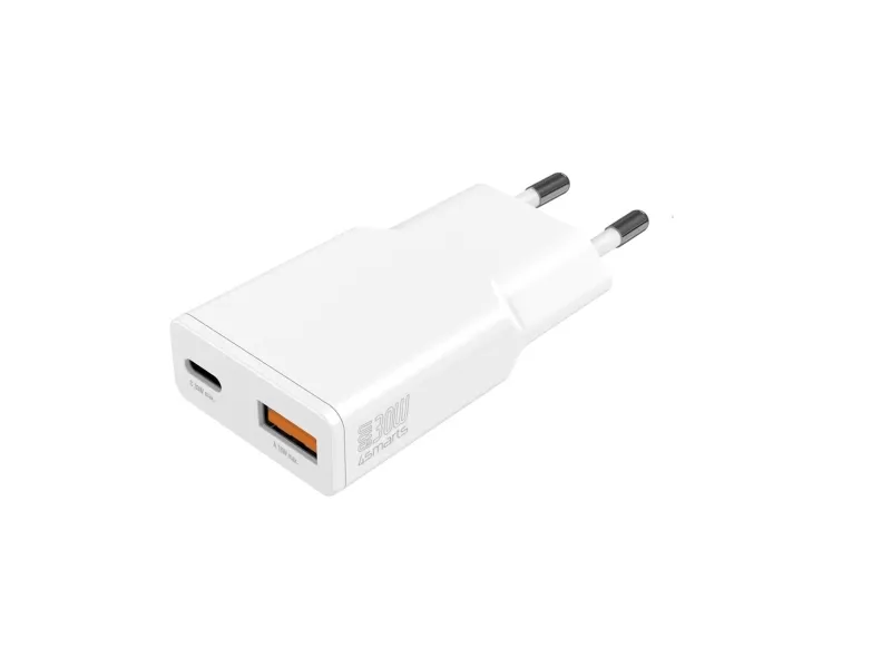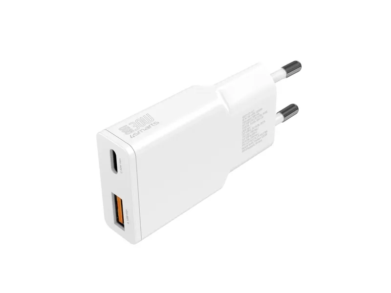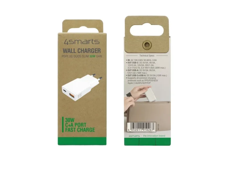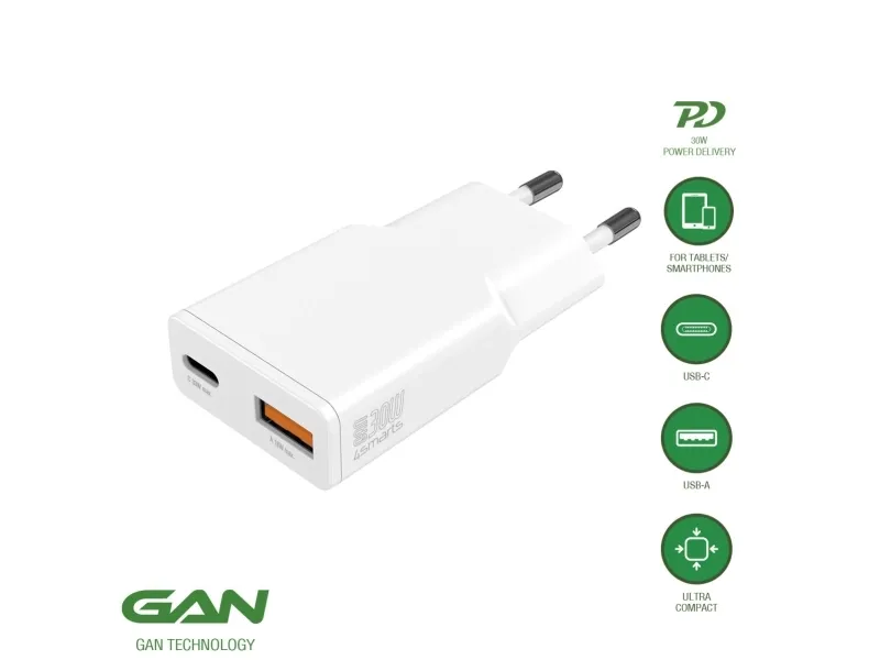 The 4smarts power adapter is an efficient charging solution designed for tablets and cellular phones. Featuring GaN technology, this wall charger offers a slim and compact design while delivering 30 watts of charging capability. With TÜV safety certification, it ensures reliable performance and safety during use. The adapter is equipped with both a 4-pin USB Type-A and a 24-pin USB-C output, accommodating various devices and enhancing versatility in charging options. Fast Charge Technology including Qualcomm Quick Charge 2.0 and 3.0, Samsung Adaptive Fast Charging, and Power Delivery 3.0 + PPS allows users to charge devices quickly, making it a practical choice for on-the-go charging needs.