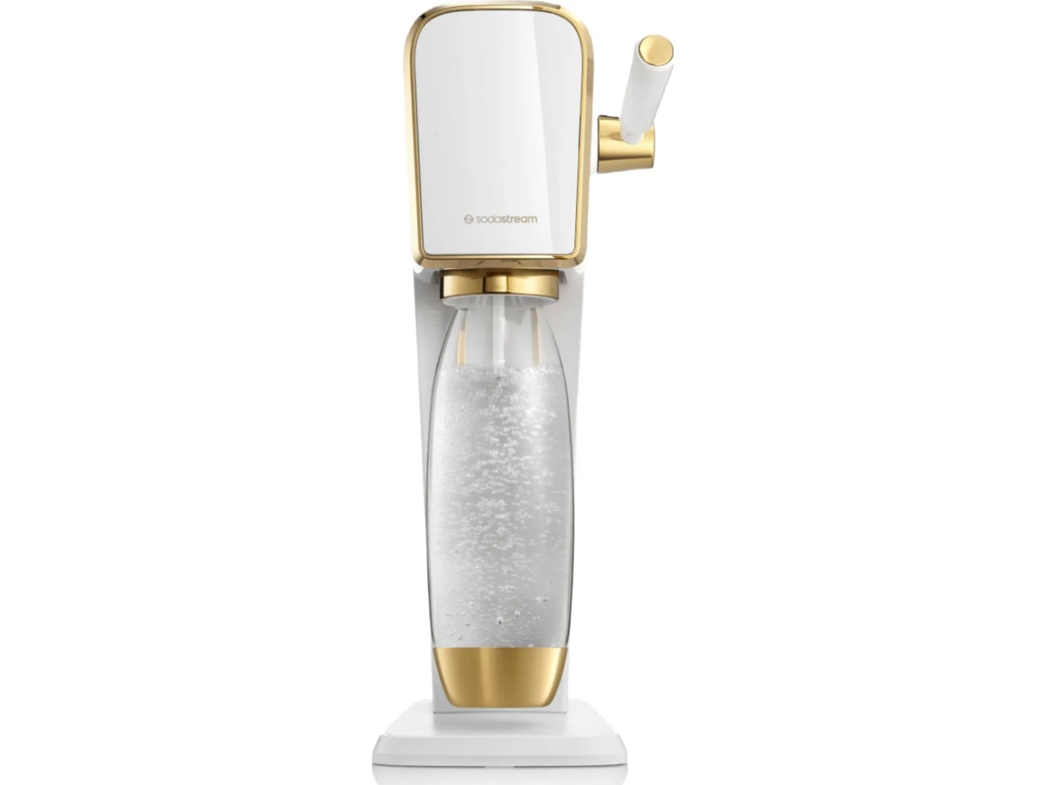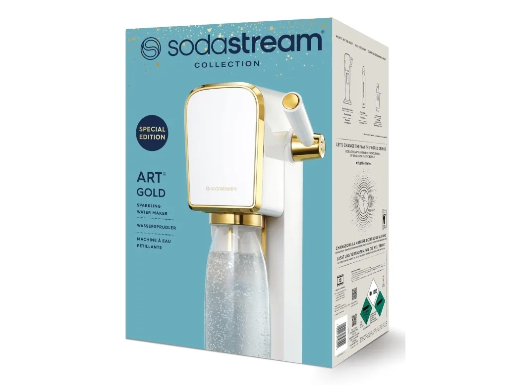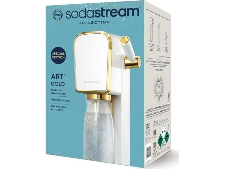 SodaStream 1013511415. Product colour: Gold, White. Width: 185 mm, Depth: 298 mm, Height: 440 mm. Package width: 613 mm, Package depth: 385 mm, Package height: 452 mm. Carbonating bottle volume: 1 L, Bottle material: Plastic, Carbonator charger capacity: 60 L. Warranty period: 2 year(s)
