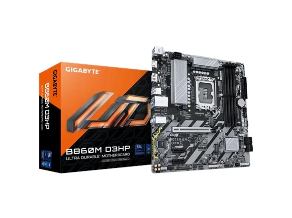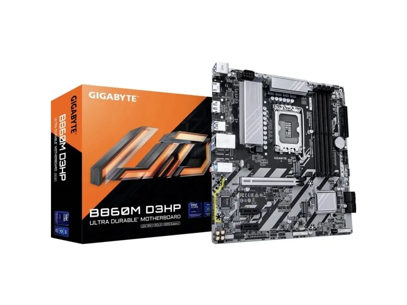 gigabyte B860M D3HP bundkort - Intel Core Ultra CPUer, 4+1+2+1-faset VRM, op til 9066MHz DDR5, 2xPCIe 4.0 M.2, GbE LAN, USB 3.2 Gen 1 Hybrid 4+1+2+1 faser 50A PPAK VRM Dual Channel DDR5: 4 DIMMs PCIe 5.0 x16 med PCIe UD stikplads & EZ-latch MOSFET kølelegeme & PCH kølelegeme 1GbE LAN, USB 3.2 Gen1 type-C Forøg din computers ydeevne med gigabytes gennemprøvede motherboard-serier: AERO og gigabyte. Med innovativt design og de mest moderne funktioner overbeviser disse boards med fremragende ydeevne og pålidelighed. Uanset om du er gamer, Content Creator eller professionel bruger, er disse serier tilpasset dine behov og garanterer en fremragende kvalitet og de nyeste teknologier.