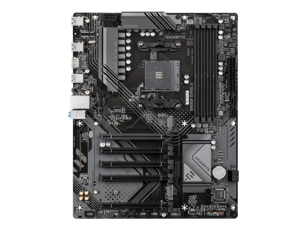The GIGABYTE B550 EAGLE motherboard offers robust performance for gamers and content creators. Built on the AMD B550 chipset, it is compatible with Ryzen processors, ensuring an efficient gaming and computing experience. With support for DDR4 SDRAM and a variety of connectivity options, including multiple USB types and high-definition audio output, it provides everything needed for a performance setup. Designed for easy installation and customization, the B550 EAGLE features a DIY-friendly design that includes RGB FUSION for personalized illumination. The advanced hardware monitoring capabilities, such as temperature and fan speed detection, keep your system running smoothly. Its 4-layer PCB and solid power design contribute to reliable operation, while the M.2 EZ Latch simplifies the installation of high-speed storage devices.