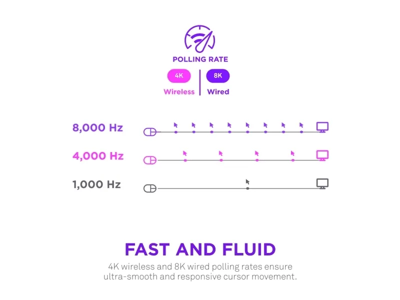 Polling rate: 8000 Hz via USB, polling rate: 4000 Hz via trådløs, 100 millioner klikk, 0,2 ms-svartid, 650 tommer pr. sekund, 50 G maskimal akselerasjon