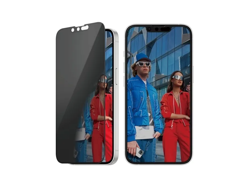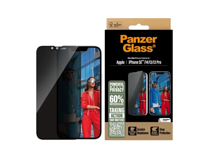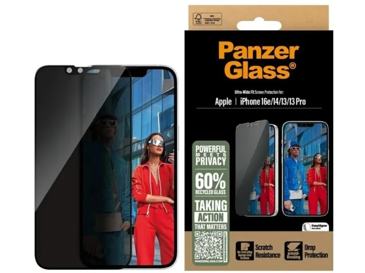 Powerful meets privacy! With this PanzerGlass privacy screen protector made of 60% recycled glass, your personal info is safe from the prying eyes of people sitting next to you on the train, in the coffee shop, or at the office. The specially designed privacy filter renders the content of your screen virtually invisible to everyone except you. It even has a smudge-free coating that reduces traces of fingerprints and grease to give you a clear – but still private – view of your screen. And the screen protection? It's outstanding! With high-level scratch resistance, this screen protector shields your phone screen from accidental bumps, crushing falls, and other hazards of everyday life. Or to put it in more sustainable terms: It prolongs the lifetime of your phone, postponing the need to produce new phones. This is one way of working toward a more sustainable future. Another is to use less packaging: In 2024, we reduced the amount of paper in our PanzerGlass core product packaging design by an average of 66%*. So, of course, this product comes in a recyclable FSC-certified box. With the enclosed EasyAligner made of 100% recycled plastic, installation is a piece of cake (seriously!). To make it even easier, we've included step-by-step instructions as well as a QR code for quick access to our online how-to video. And remember: Once installed, you'll never again fear your phone falling screen-first. This might not happen, but then again … it might! The screen protector is Ultra-Wide Fit. This means it covers the front surface of your phone, providing a complete view of your screen while leaving a little room around the edges for a PanzerGlass case, for example, a fearlessly fashionable case from CARE by PanzerGlass . And if you're thinking: "What if my camera lenses get scratched?" Well, help is just a few clicks away: Combine your screen protector and case with PanzerGlass PicturePerfect or Hoops . *Reduction from 2022-2024 measured by comparing selected products from the PanzerGlass core range.