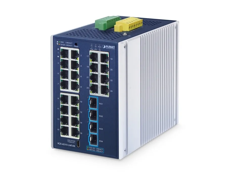 Designed to thrive in demanding industrial environments, the IGS-4215-24T4X is PLANET's latest addition to its DIN-rail L2/L4 Managed Gigabit switch lineup. This model combines exceptional performance with cost-efficiency, featuring robust network management capabilities with IPv6/IPv4 dual-stack support and an integrated L2/L4 Gigabit switching engine. It is equipped with 24 10/100/1000BASE-T ports and 4 10GBASE-X SFP+ fiber slots, offering flexible and reliable network connections. The switch ensures stable operation across a wide temperature range of -40 to 75°C, making it suitable for various industrial applications. Additionally, the USB Type-C console port allows for straightforward management, while the rugged IP30 aluminum casing guarantees durability and resilience in harsh conditions.