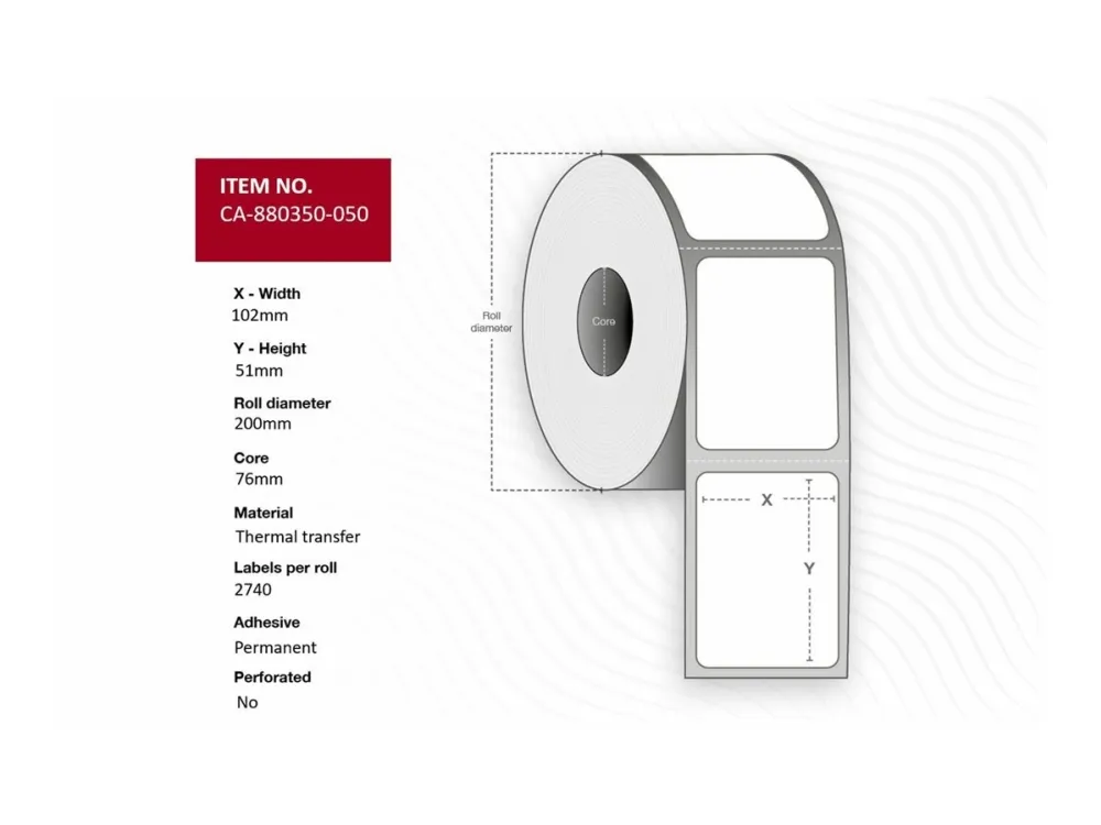 Capture tilbyr et forbruksmedium for termotransferskrivere som er utviklet for etiketter. Med en mediestørrelse på 102 x 51 mm gir dette produktet etikettplass til ulike bruksområder. Hver rull inneholder 2740 etiketter, noe som sikrer en effektiv utskriftsprosess som passer til miljøer med høy etterspørsel. Det permanente klebemiddelet sørger for at etikettene sitter godt fast, noe som gir profesjonell kvalitet i alle miljøer.