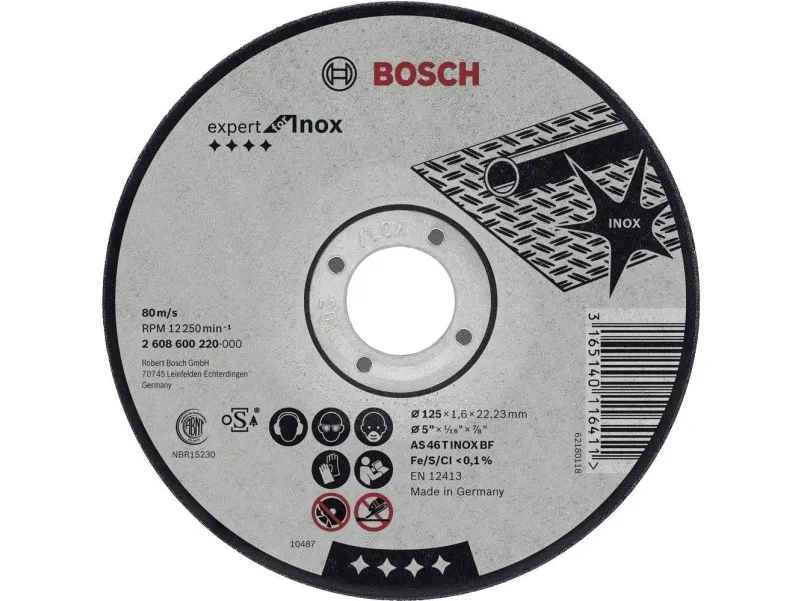 Skæreskive Expert for inox kombinerer enorm skæreydelse i stål med maksimal sikkerhed. Skiven består af særligt hård premium-aluminiumoxid med funktionelle filler- og tilsætningsstoffer, som reducerer varmeudviklingen ved skæring. Resultatet er en førsteklasses snitflade og en lang levetid for skiven. Derudover er skiven fri for jern, svovl og klorerede fyldstoffer. Det præcisionsfremstillede glasfiberstof på skiven sørger for maksimal arbejdssikkerhed. Brug denne skive til skæring af stål. Til vinkelslibere. Skæreskiver fra Bosch opfylder de højeste sikkerhedskrav som en 12413, FEPA og OSA. Specifikation: AS 46 T INOX BF, diameter mm: 125, boringsdiameter mm: 22,23, tykkelse mm: 2,0
