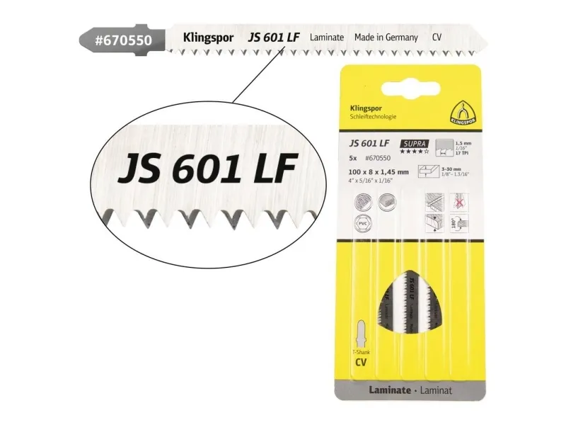 JS 601 LF stiksavklinger, 100 x 8 x 1,45 mm nyttelængde 75krom, krydsslebet, konisk , 17 tænder pr. tomme, SB-emballeret i karton Meget rene, lige og splittede snit på begge sider i plast og plastbelagte materialer - topseller til laminat og vinylparket