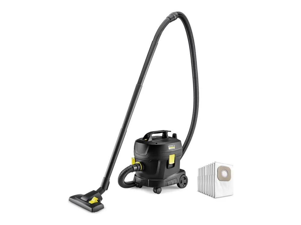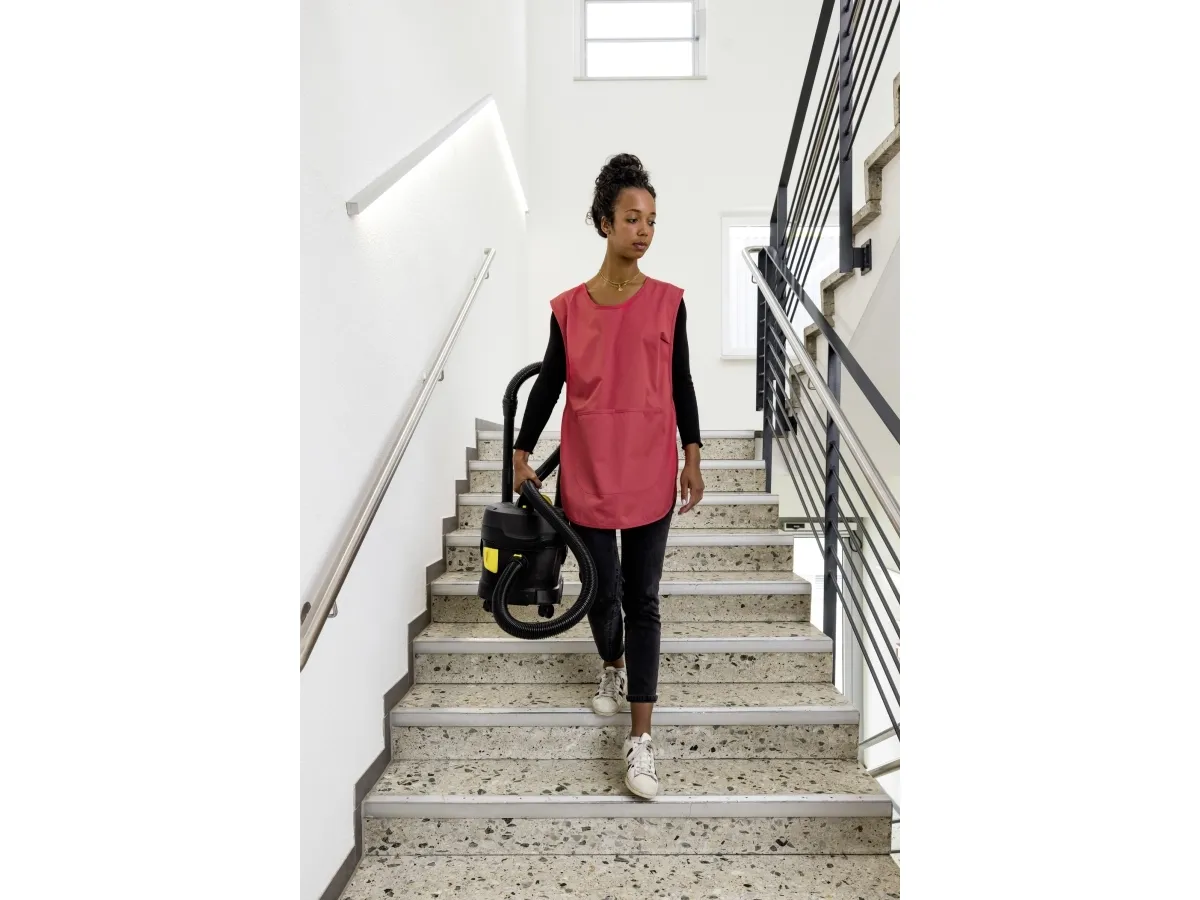 Kärcher T 11/1 er bygget med fokus på bærekraft og inneholder 60 % resirkulert plast i konstruksjonen, i tråd med moderne miljøstandarder. Den integrerte tilbehørsoppbevaringen gjør det mulig å organisere verktøyene, slik at rengjøringsutstyret alltid er innen rekkevidde når det trengs. Med et lydtrykknivå på 61 dB(A) er denne støvsugeren stillegående, noe som gjør den til et praktisk valg for hjemmet eller arbeidsplassen.